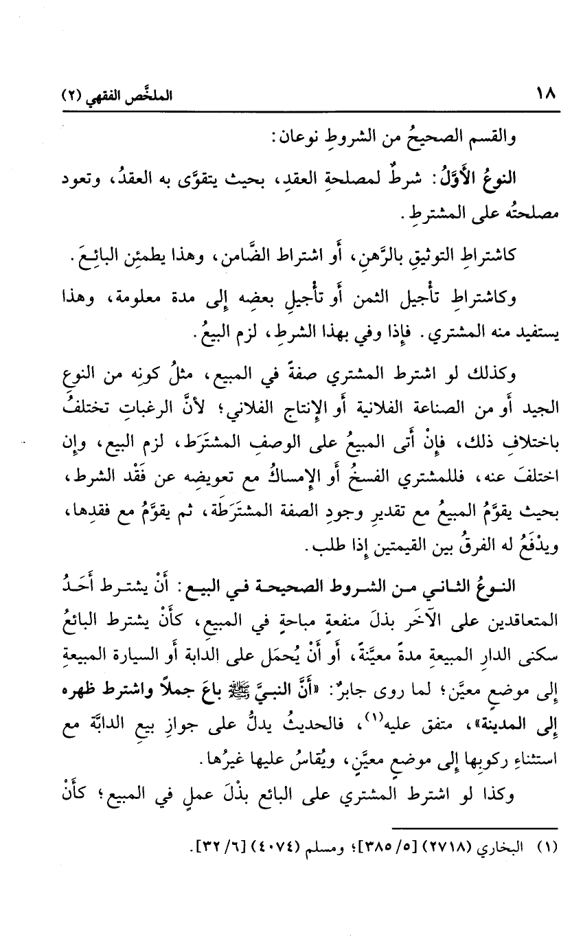 النوع الثاني من الشروط الصحيحة في البيع: أن يشترط أحد المتعاقدين على الآخر بذل منفعة مباحة في المبيع؛ كأن يشترط البائع سكنى الدار المبيعة مدة معينة، أو أن يحمل على الدابة أو السيارة المبيعة إلى موضع معين؛ لما روى جابر: "أن النبي صلى الله عليه وسلم باع جملاً واشترط ظهره إلى المدنية"، متفق عليه؛ فالحديث يدل على جواز بيع الدابة مع استثناء ركوبها إلى موضع معين، ويقاس عليها غيرها، وكذا لو اشترط المشتري على البائع بذل عمل في المبيع؛ كأن