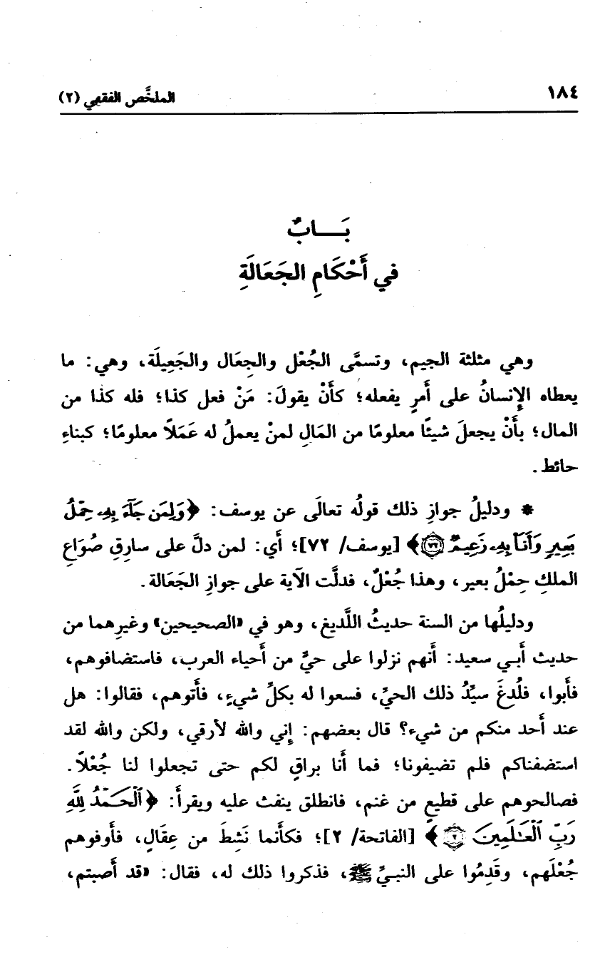 ودليلها من السنة: حديث اللديع، وهو في "الصحيحين" وغيرهما من حديث أبي سعيد: أنهم نزلوا على حي من أحياء العرب، فاستضافوهم، فأبوا، فلدغ سيد ذلك الحي، فسعوا له بكل شيء، فأتوهم، فقالوا: هل عند أحد منكم من شيء؟ قال بعضهم: إني والله لأرقي، ولكن والله لقد استضفناكم فلم تضيفونا؛ فما أنا براق لكم حتى تجعلوا لنا جعلاً. فصالحوهم على قطيع من غنم، فانطلق ينفث عليه ويقرأ: "الحمد لله رب العالمين"؛ فكأنما نشط من عقال، فأوفوهم جعلهم، وقدموا على النبي صلى الله عليه وسلم، فذكروا ذلك له، فقال: "أصبتم،