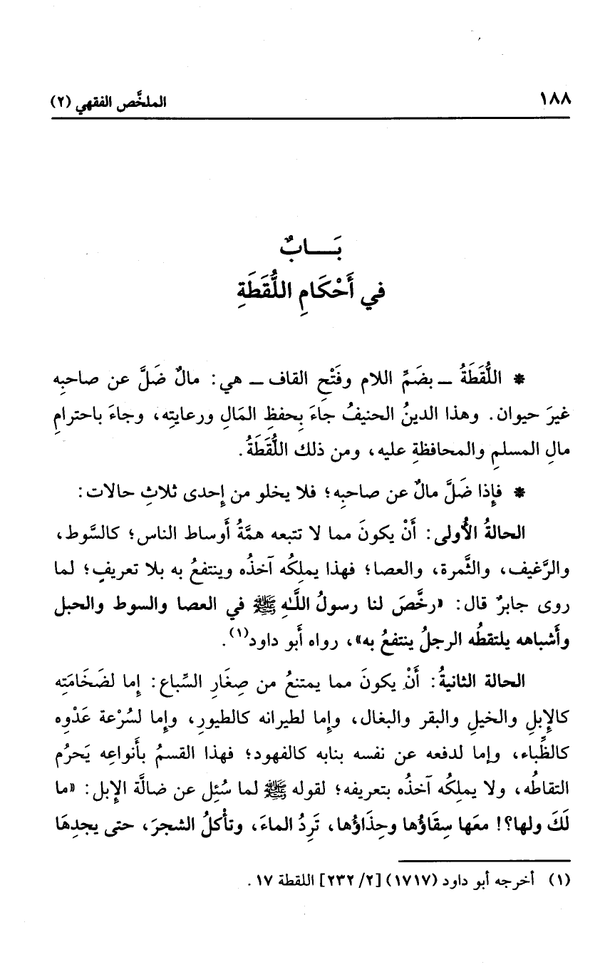 الحالة الثانية: أن يكون مما يمتنع من صغار السباع: إما لضخامته كالإبل والخيل والبقر والبغال، وإما لطيرانه كالطيور، وإما لسرعة عدوها كالظباء، وإما لدفعها عن نفسها بنابها كالفهود؛ فهذا القسم بأنواعه يحرم التقاطه، ولا يملكه آخذه بتعريفه؛ لقوله صلى الله عليه وسلم لما سئل عن ضالة الإبل: "مالك ولها؟! معها سقاؤها وحذاؤها، ترد الماء، وتأكل الشجر، حتى يجدها ربها"، متفق عليه، وقال عمر: "من أخذ الضالة؛ فهو ضال"؛ أي: مخطئ، وقد حكم صلى الله عليه وسلم في الحديث بأنها لا تلتقط، بل تترك ترد الماء وتأكل الشجر حتى يلقاها