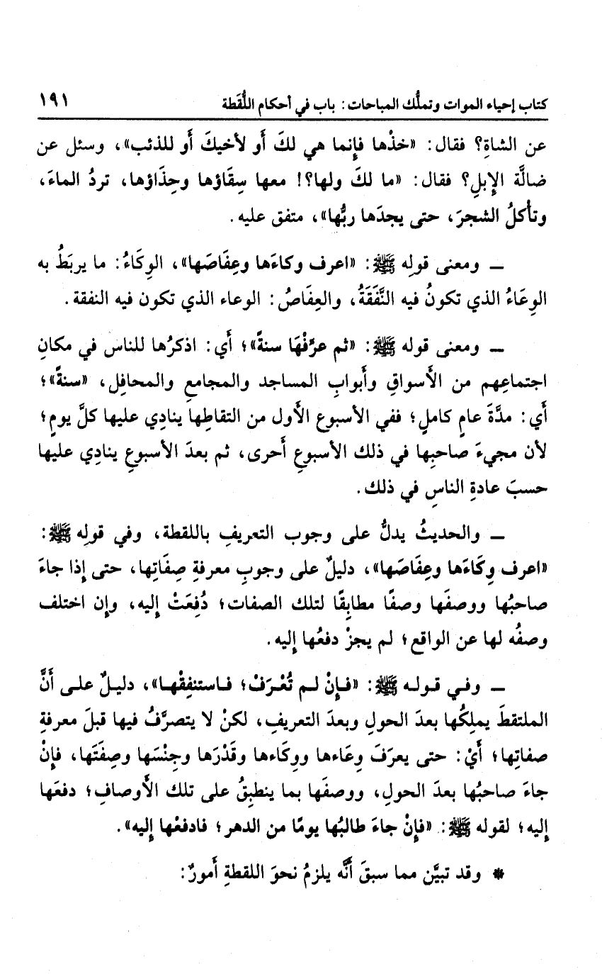 عن الشاة؟، فقال: "فإنما هي لك أو لأخيك أو للذئب"، وسئل عن ضالة الإبل؟، فقال: "ما لك ولها؟!، معها سقاؤها وحذاؤها، ترد الماء، وتأكل الشجر، حتى يجدها ربها"، متفق عليه.