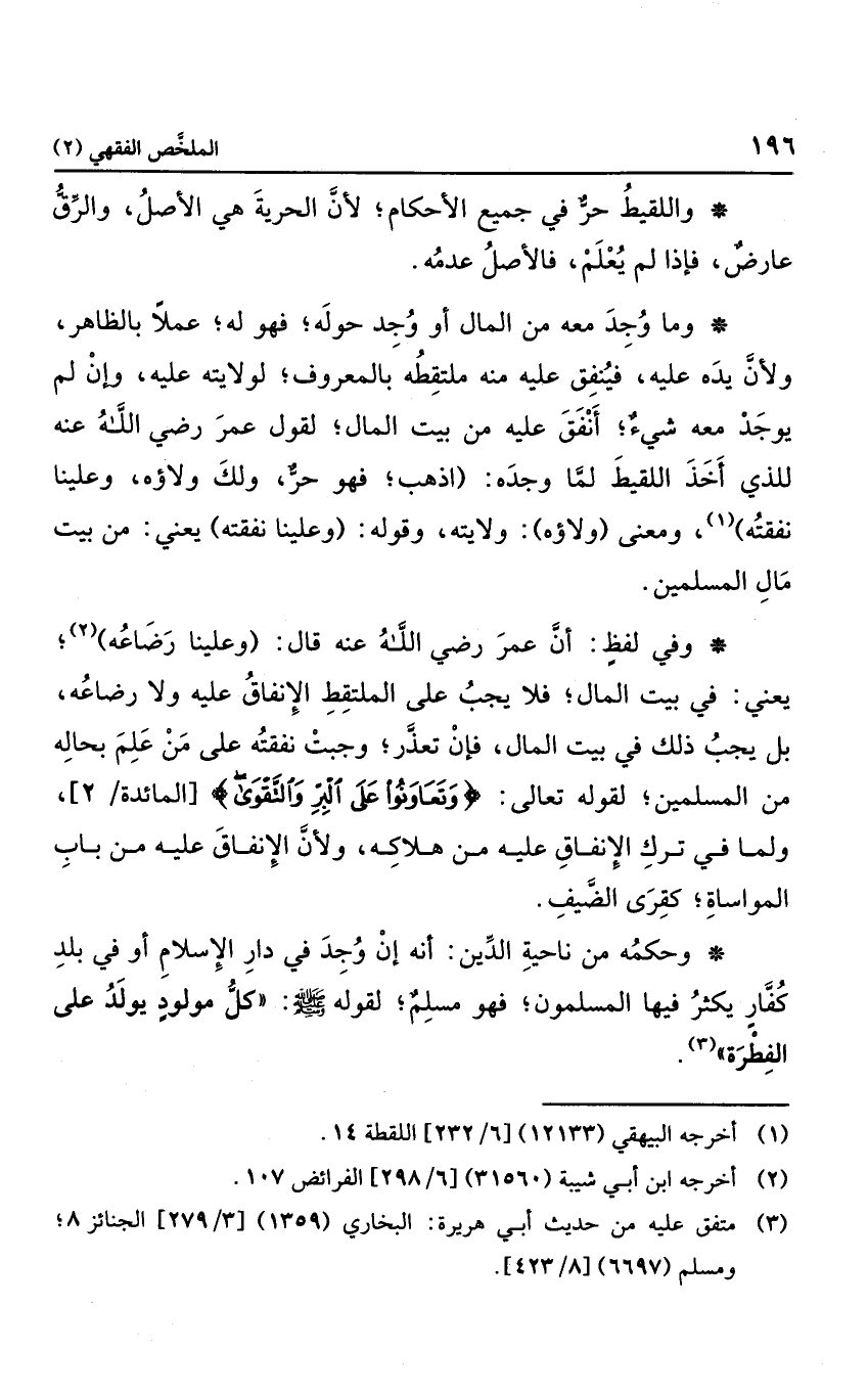 وفي لفظ أن عمر رضي الله عنه قال: "وعلينا رضاعه"؛ يعني: في بيت المال؛ فلا يجب على الملتقط الإنفاق عليه ولا رضاعه، بل يجب ذلك في بيت المال، فإن تعذر؛ وجببت نفقه على من علم بحاله من المسلمين؛ لقوله تعالى: {وَتَعَاوَنُوا عَلَى الْبِرِّ وَالتَّقْوَى} ، ولما في ترك الإنفاق عليه من هلاكه، ولأن الإنفاق عليه من باب المواساة؛ كقرى الضيف.