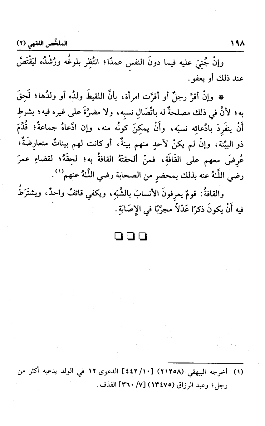وإن أقر رجل أو أقرت امرأة بأن اللقيط ولده أو ولدها؛ لحق به؛ لأن في ذلك مصلحة له باتصال نسبه، ولا مضرة على غيره فيه؛ بشرط أن ينفرد بادعائه نسبه مصلحه له باتصال نسبه، ولا مضرة على غيره فيه؛ بشرط أن ينفرد بادعائه نسبه، وأن يمكن كونه منه، وإن ادعاه جماعة؛ قدم ذو البينة، وإن لم يكن لأحد منهم بينة، أو كانت لهم بينات متعارضة؛ عرض معهم على القافة، فمن ألحقته القافة به؛ لحقه؛ لقضاء عمر رضي الله عنه بذلك بمحضر من الصحابة رضي الله عنهم والقافة يعرفون الأنساب بالشبه، ويكفي قائف واحد، ويشترط فيه أن يكون ذكرًا عدلاً مجربا في الإصابة.