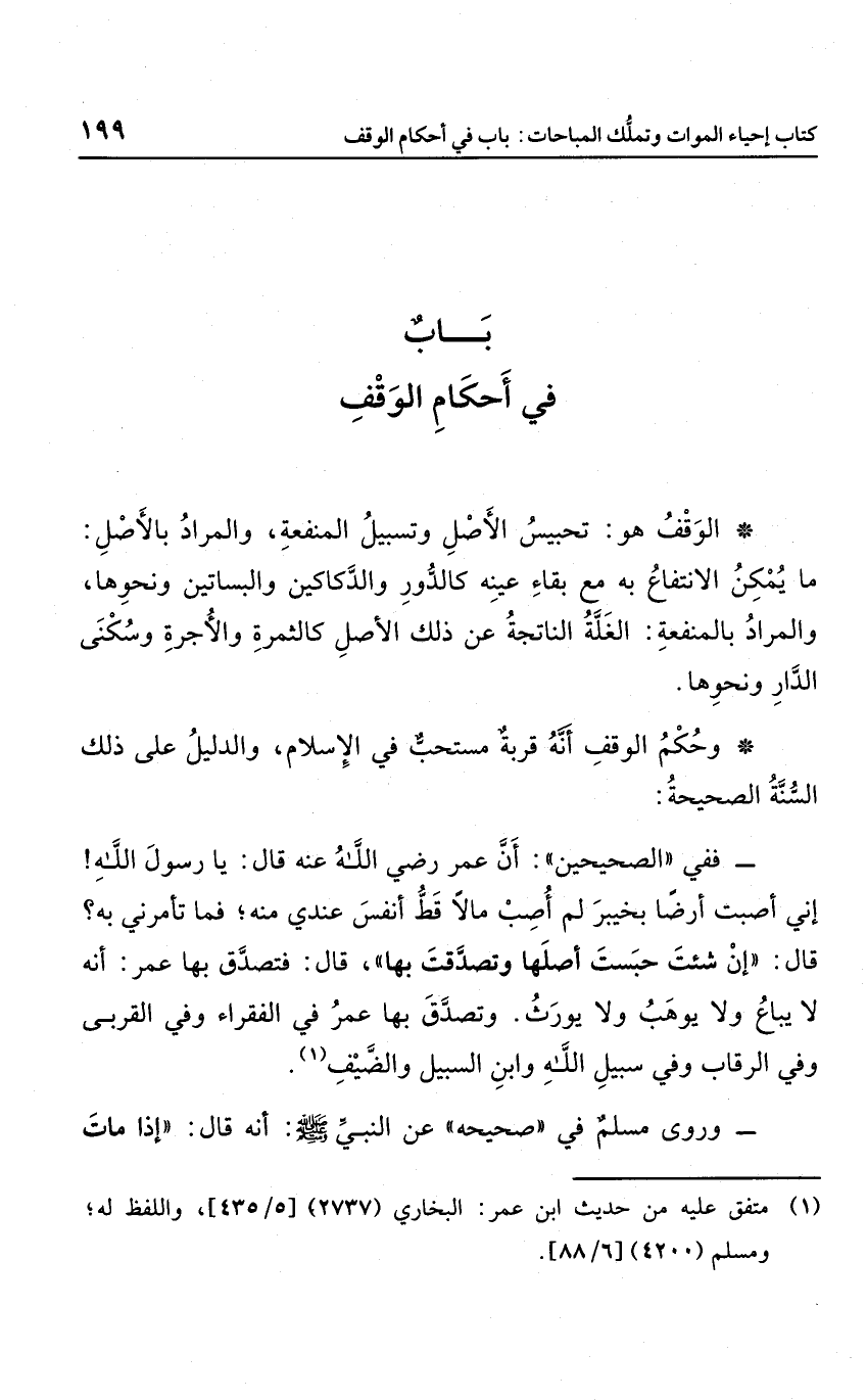ففي "الصحيحين": أن عمر رضي الله عنه قال: يا رسول الله! إني أصبحت مالاً بخيبر لم أصب قط مالاً أنفس عندي منه؛ فما تأمرني فيه؟ قال: "إن شئت حبست أصلها وتصدقت بها، غير أنه لا يباع أصلها ولا يوهب ولا يورث"، فتصدق بها عمر في الفقراء وذوي القربى والرقاب وفي سبيل الله وابن السبيل والضيف.