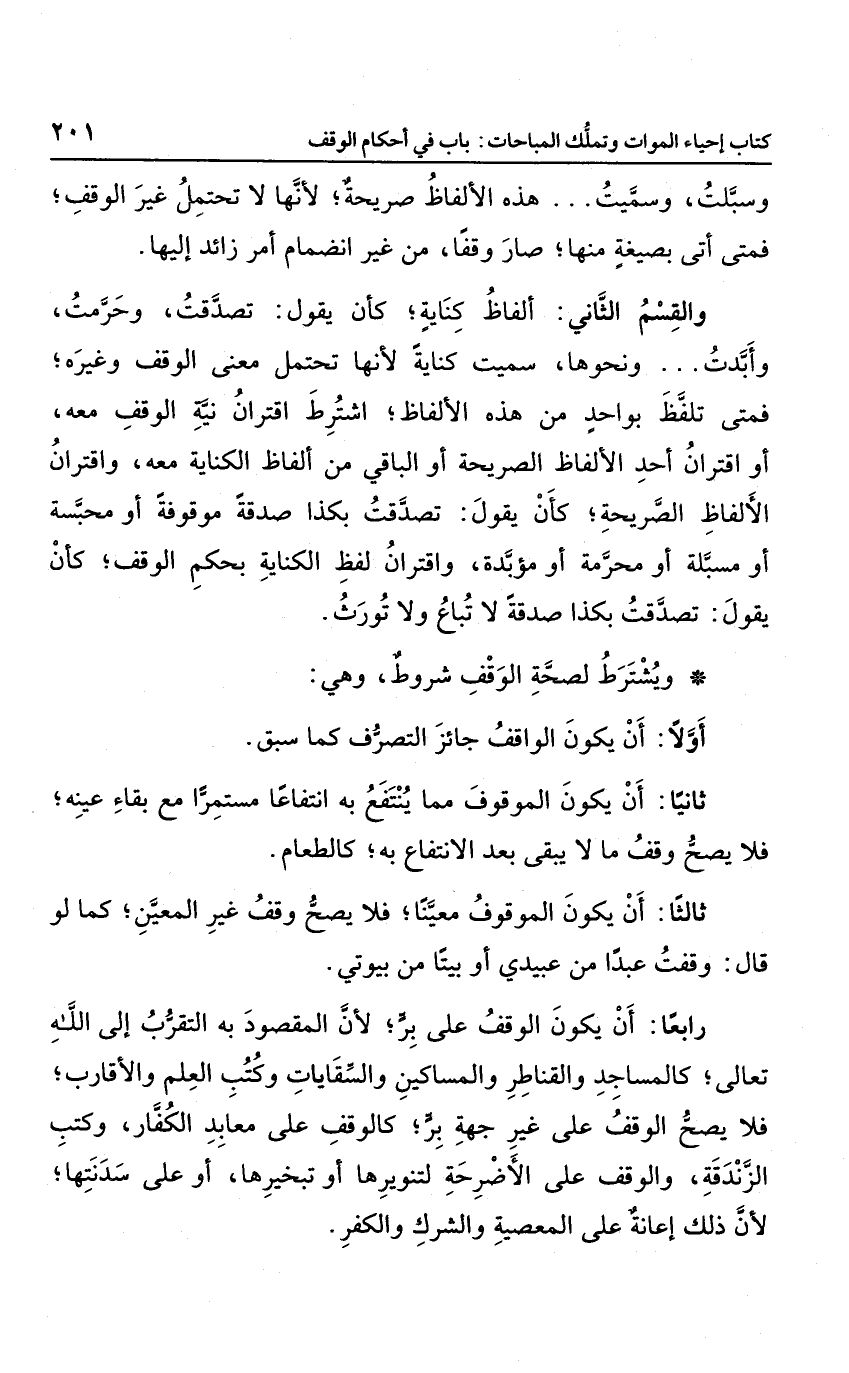 رابعا: أن يكون الوقف على بر؛ لأن المقصود به التقرب إلى الله تعالى؛ كالمساجد والقناطر والمساكين والسقايات وكتب العلم والأقارب؛ فلا يصح الوقف على غير جهة بر؛ كالوقف على معابد الكفار، وكتب الزندقة، والوقف على الأضرحة لتنويرها أو تبخيرها، أو على سدنتها؛ لأن ذلك إعانة على المعصية والشرك والكفر.