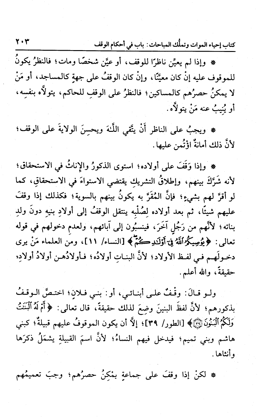 ولو قال: وقف على أبنائي، أو: بني فلان؛ اختص الوقف بذكورهم؛ لأن لفظ البنين وضع لذلك حقيقة، قال تعالى: {أَمْ لَهُ الْبَنَاتُ وَلَكُمُ الْبَنُونَ} ؛ إلا أن يكون الموقوف عليهم قبيلة؛ كبني هاشم وبني تميم؛ فيدخل فيهم النساء؛ لأن اسم القبيلة يشمل ذكرها وأنثاها.