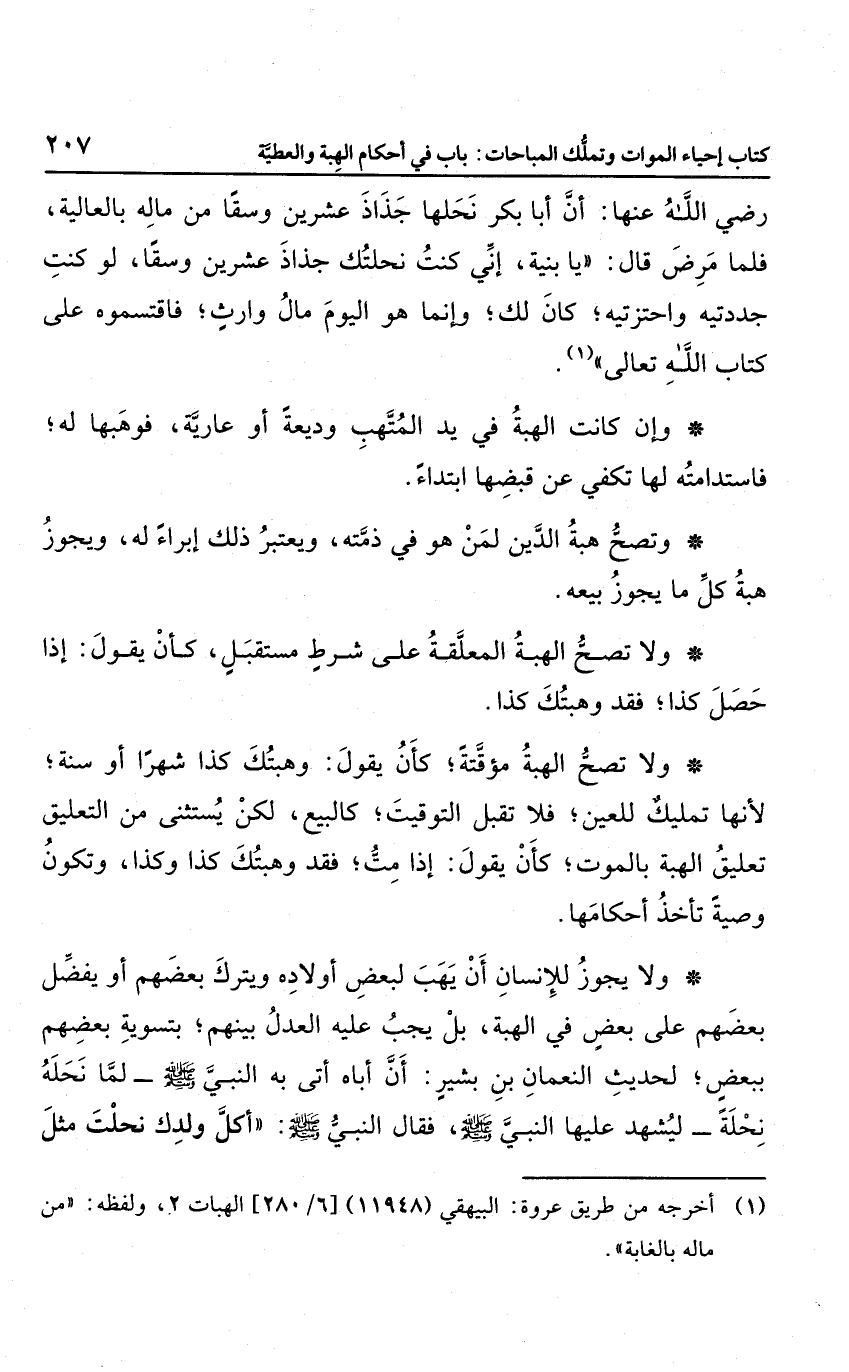 ولا يجوز للإنسان أن يهب لبعض أولاده ويترك بعضهم أو يفضل بعضهم على بعض في الهبة، بل يجب عليه العدل بينهم؛ بتسوية بعضهم ببعض؛ لحديث النعمان بن بشير: أن أباه أتى به النبي صلى الله عليه وسلم لما نحله نحلة ليشهد عليها النبي صلى الله عليه وسلم، فقال النبي صلى الله عليه وسلم: "أكل ولدك نحلت مثل