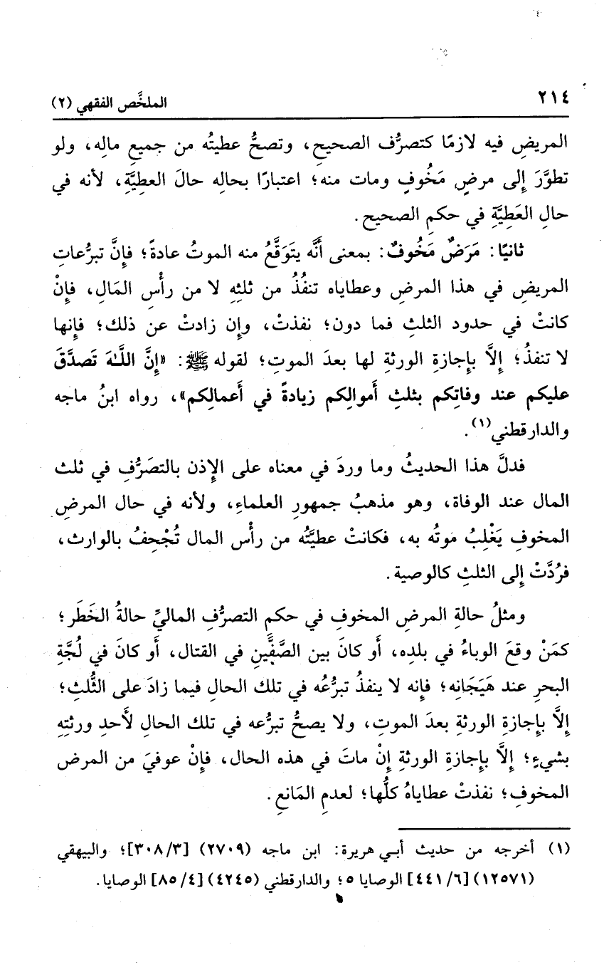 ثانيا: مرض مخوف، بمعنى: أنه يتوقع منه الموت عادة؛ فإن تبرعات المريض في هذا المرض وعطاياه تنفذ من ثلثه لا من رأس المال، فإن كانت في حدود الثلث فما دون؛ نفذت، وإن ذادت عن ذلك؛ فإنها لا تنفذ؛ إلا بإجازة الورثة لها بعد الموت؛ لقوله صلى الله عليه وسلم: "إن الله تصدق عليكم عند وفاتكم بثلث أموالكم زيادة في أعمالكم"، رواه ابن ماجه والدارقطني.