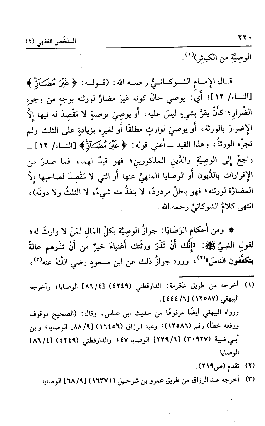ومن أحكام الوصايا: جواز الوصية بكل المال لمن لا وارث له؛ لقول النبي صلى الله عليه وسلم: "إنك إن تذر ورثتك أغنياء خير من أن تذرهم عالة يتكففون الناس"، وورد جواز ذلك عن ابن مسعود رضي الله عنه،