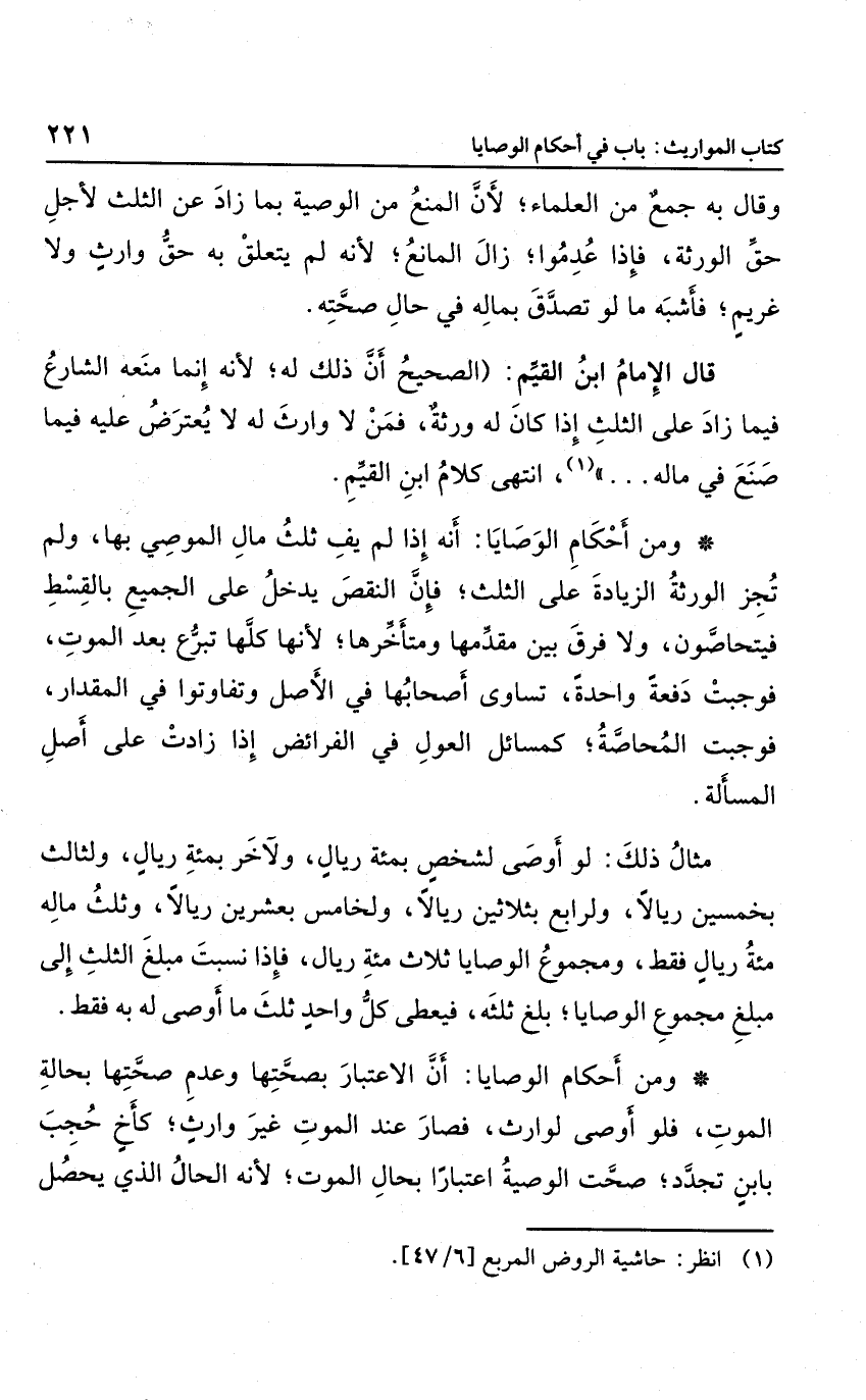 مثال ذلك: أو أوصى لشخص بمئة ريال، ولآخر بمئة ريال، ولثالث بخمسين ريالاً، ولرابع بثلاثين ريالاً، وثلث ماله مئة ريال فقط، ومجموع الوصايا ثلاث مئة ريال، فإذا نسبت مبلغ الثلث إلى مبلغ مجموع الوصايا؛ بلغ ثلثه، فيعطي كل واحد ثلث ما أوصى له به فقط.