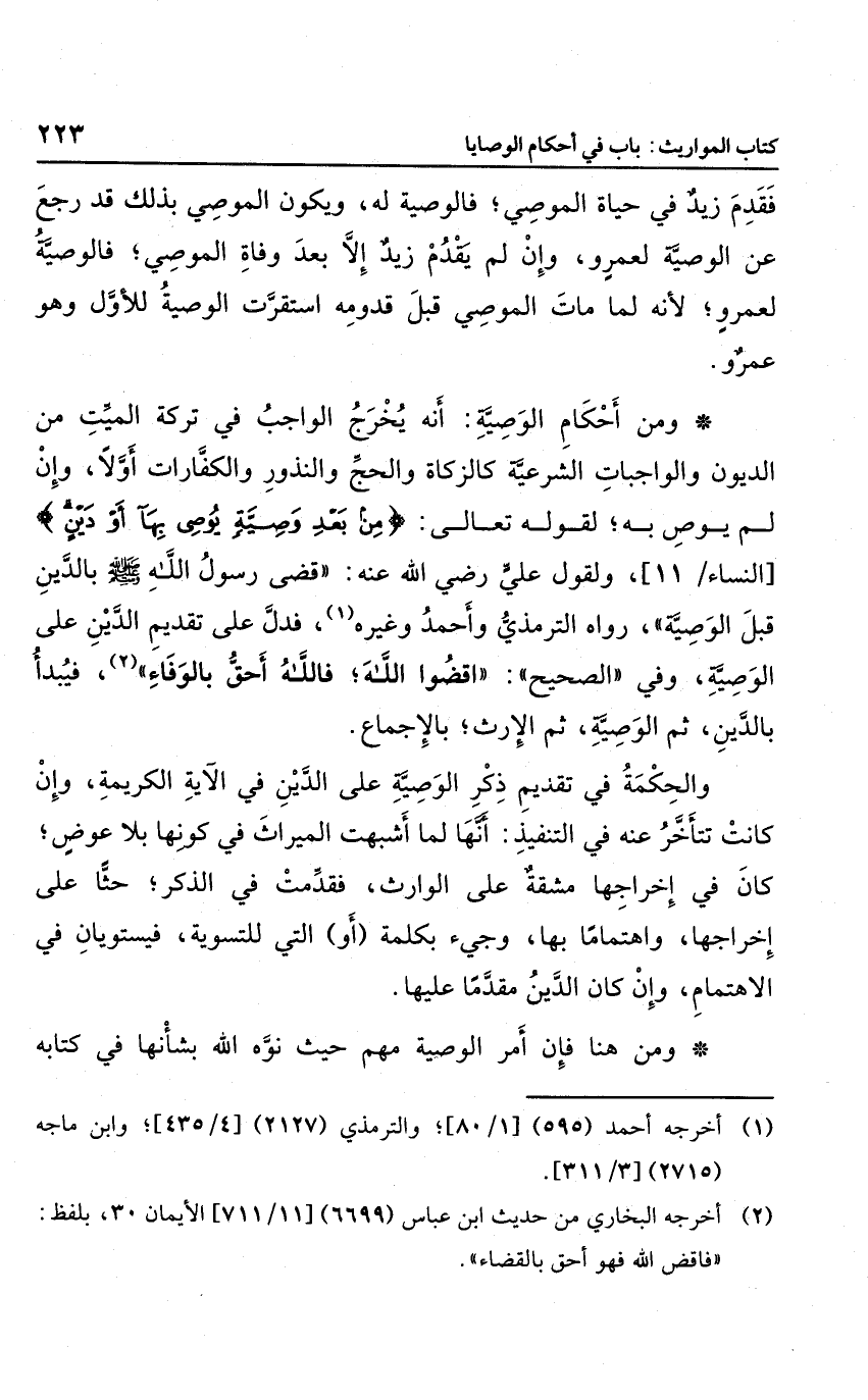 ولقول علي رضي الله عنه: "قضى رسول الله صلى الله عليه وسلم بالدين قبل الوصية" رواه الترمذي وأحمد وغيره، فدل على تقديم الدين على الوصية، وفي "الصحيح": "اقضوا الله؛ فالله أحق بالوفاء"، فيبدأ بالدين ثم الوصية، ثم الإرث؛ بالإجماع.