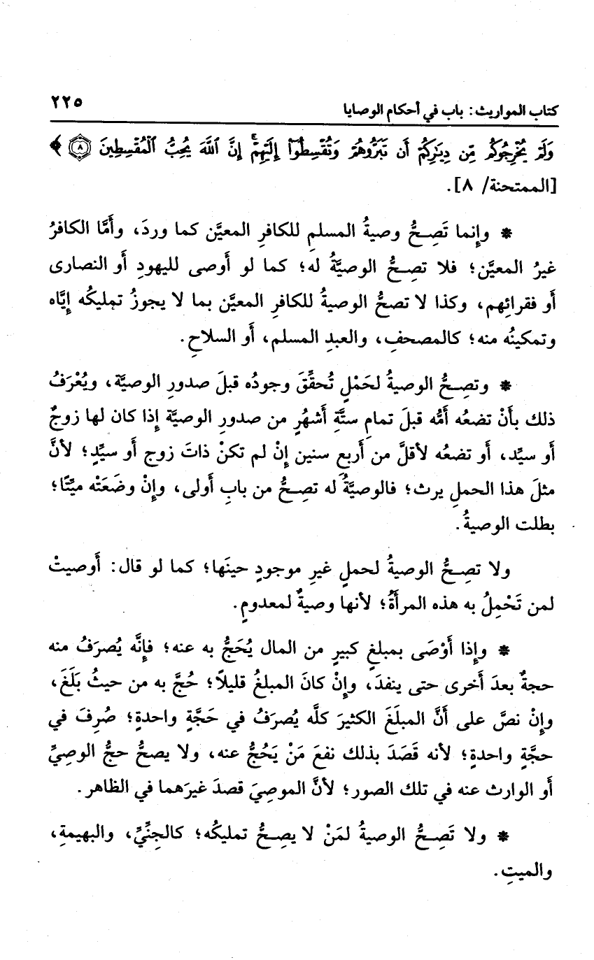 وإنما تصح وصية المسلم للكافر المعين كما ورد، وأما الكافر غير المعين؛ فلا تصح الوصية له؛ كما لو أوصى لليهود أو النصارى أو فقرائهم، وكذا لا تصح الوصية للكافر المعين بما لا يجوز تمليكه إياه وتمكينه منه؛ كالمصحف، والعبد المسلم، أو السلاح.