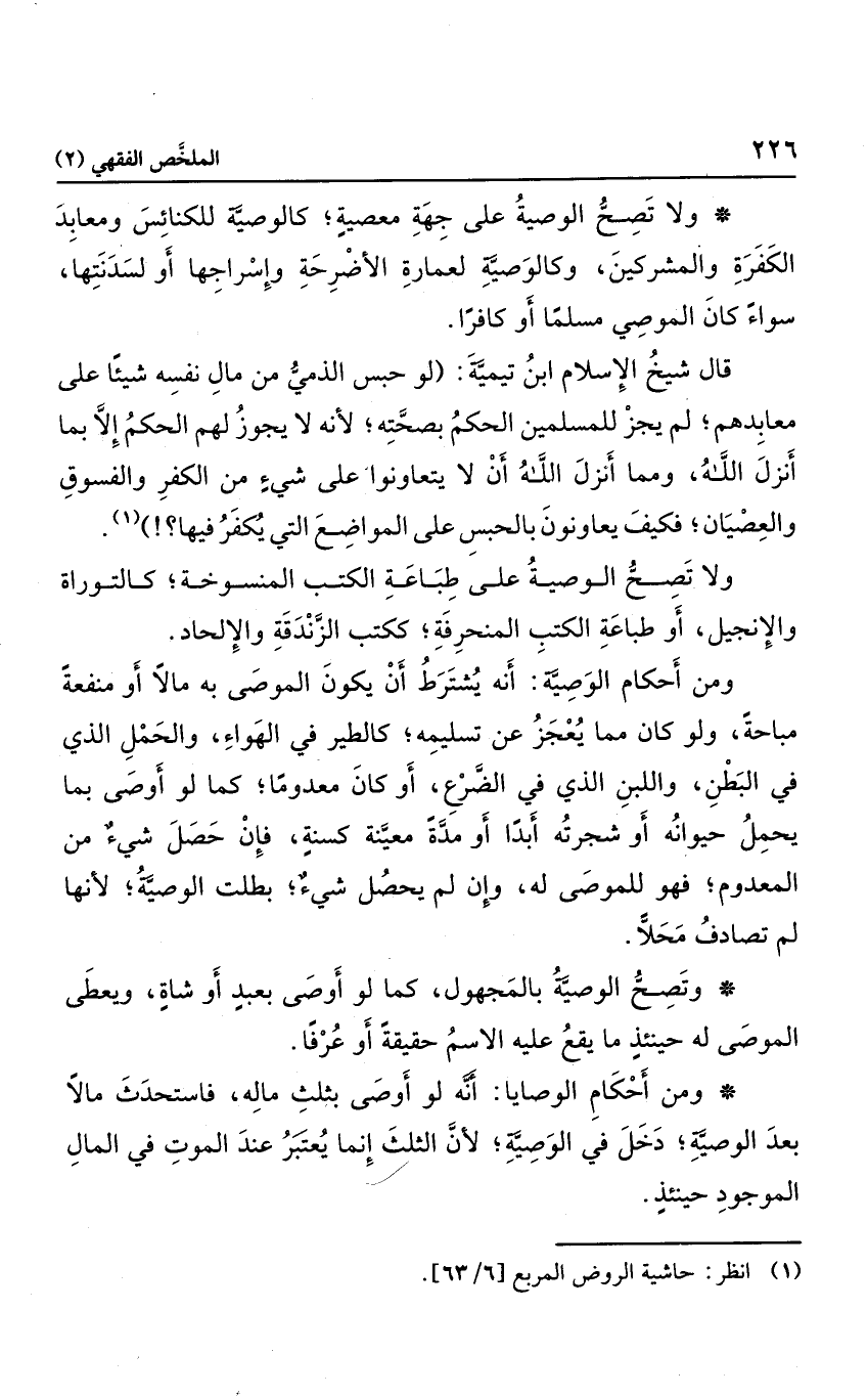 ومن أحكام الوصية: أنه يشترط أن يكون الموصى به مالاً أو منفعة مباحة، ولو كان مما يعجز عن تسليمه؛ كالطير في الهواء، والحمل الذي في البطن، واللبن الذي في الضرع، أو كان معدوما؛ كما لو أوصى بما يحمل حيوانه أو شجرته أبدًا أو مدة معينة كسنة، فإن حصل شيء من المعدوم؛ فهو للموصى له، وإن لم يحصل شيء؛ بطلت الوصية؛ لأنها لم تصادف محلاًّ.