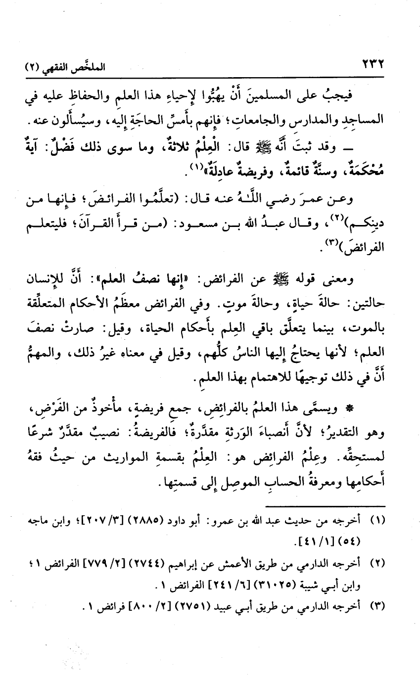 وقد ثبت أنه صلى الله عليه وسلم قال: "العلم ثلاثة، وما سوى ذلك فضل: آية محكمة، وسنة قائمة، وفريضة عادلة".