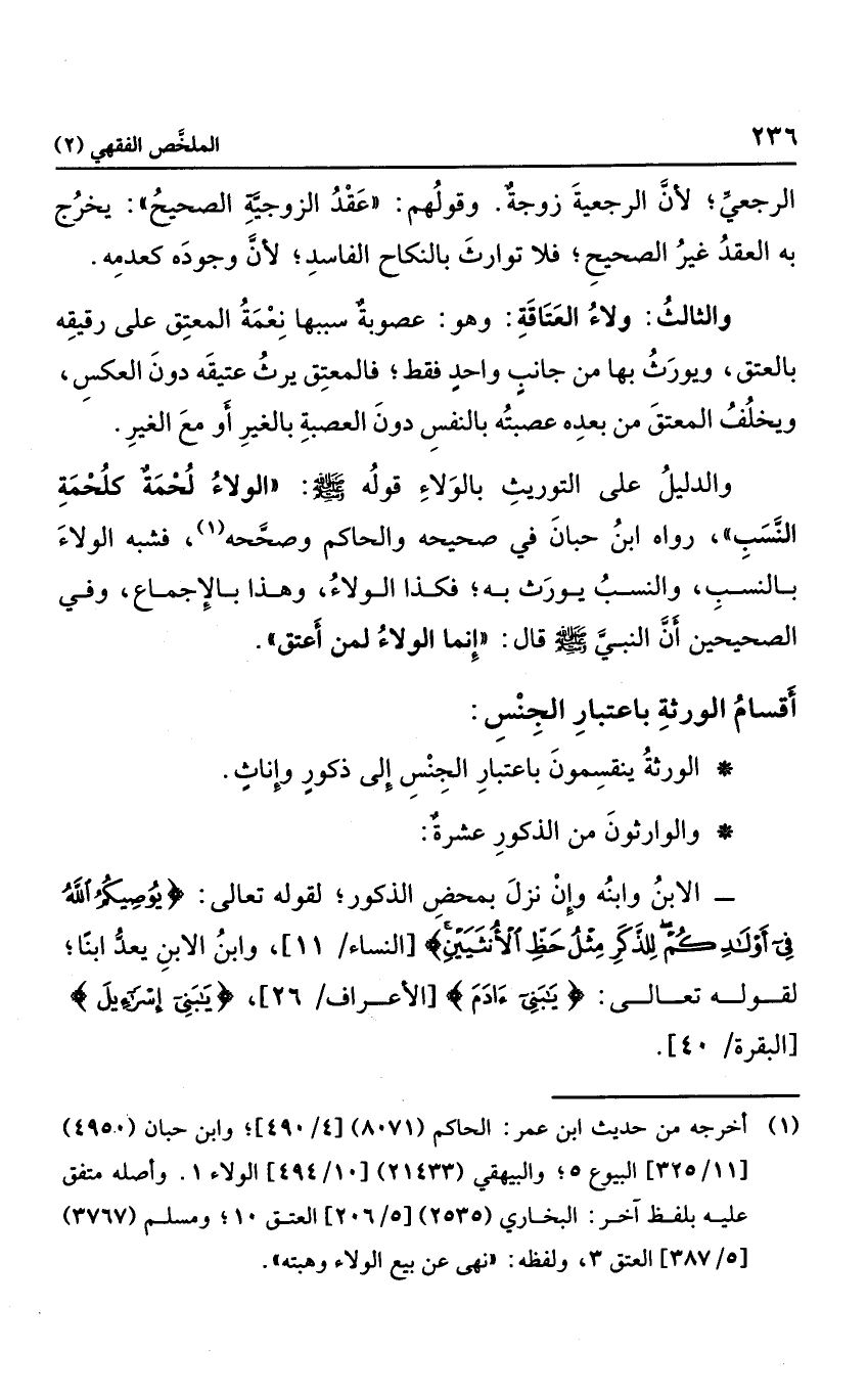 والدليل على التواريث بالولاء قوله صلى الله عليه وسلم: "الولاء لحمة كلحمة النسب"، رواه ابن حبان في "صحيحة" والحاكم وصحيحه، فشبه الولاء بالنسب، والنسب يورث به؛ فكذا الولاء، وهذا بالإجماع، وفي "الصحيحين" أن النبي صلى الله عليه وسلم قال: "إنما الولاء لمن أعتق".