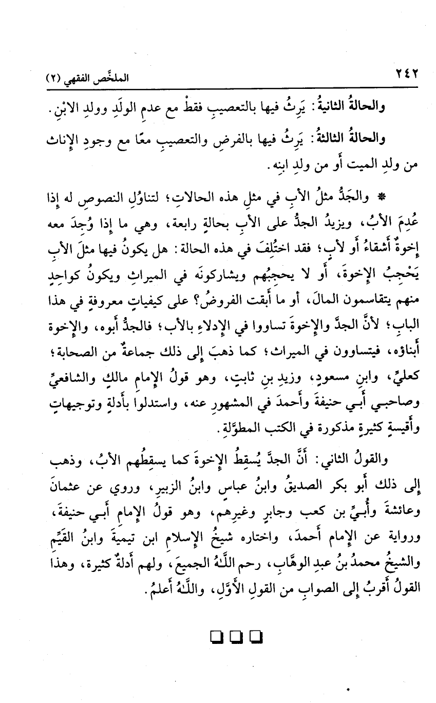 والجد مثل الأب في مثل هذه الحالات؛ لتناول النصوص له إذا عدم الأب، ويزيد الجد على الأب حالة رابعة، وهي ما إذا وجد معه إخوة أشقاء أو لأب، فقد اختلف في هذه الحالة: هل يكون فيها مثل الأب يحجب الأخوة أو لا يحجبهم ويشاركونه في الميراث ويكون كواحد منهم يتقاسمون المال أو ما أبقت الفروض على كيفيات معروفة في هذا الباب؛ لأن الجد والإخوة تساووا في الإدلاء بالأب؛ فالجد أبوه، والإخوة أبناؤه، فيتساوون في الميراث؛ كما ذهب إلى ذلك جماعة من الصحابة؛ كعلي، وابن مسعود، وزيد بن ثابت، وهو قول الإمام مالك والشافعي وصاحبي أبي حنيفة وأحمد في المشهور عنه، واستدلوا بأدلة وتوجيهات وأقيسة كثيرة في الكتب المطولة. والقول الثاني أن الجد يسقط الأخوة كما يسقطهم الأب، وذهب إلى ذلك أبو بكر الصديق وابن عباس وابن الزبير، وروي عن عثمان وعائشة وأبي كعب وجابر وغيرهم، وهو قول الإمام أبي حنيفة، ورواية عن الإمام أحمد، واختاره شيخ الإسلام ابن تيمية وابن القيم والشيخ محمد بن عبد الوهاب رحم الله الجميع، ولهم أدلة كثيرة، وهذا القول أقرب إلى الصواب من القول الأول، والله أعلم.