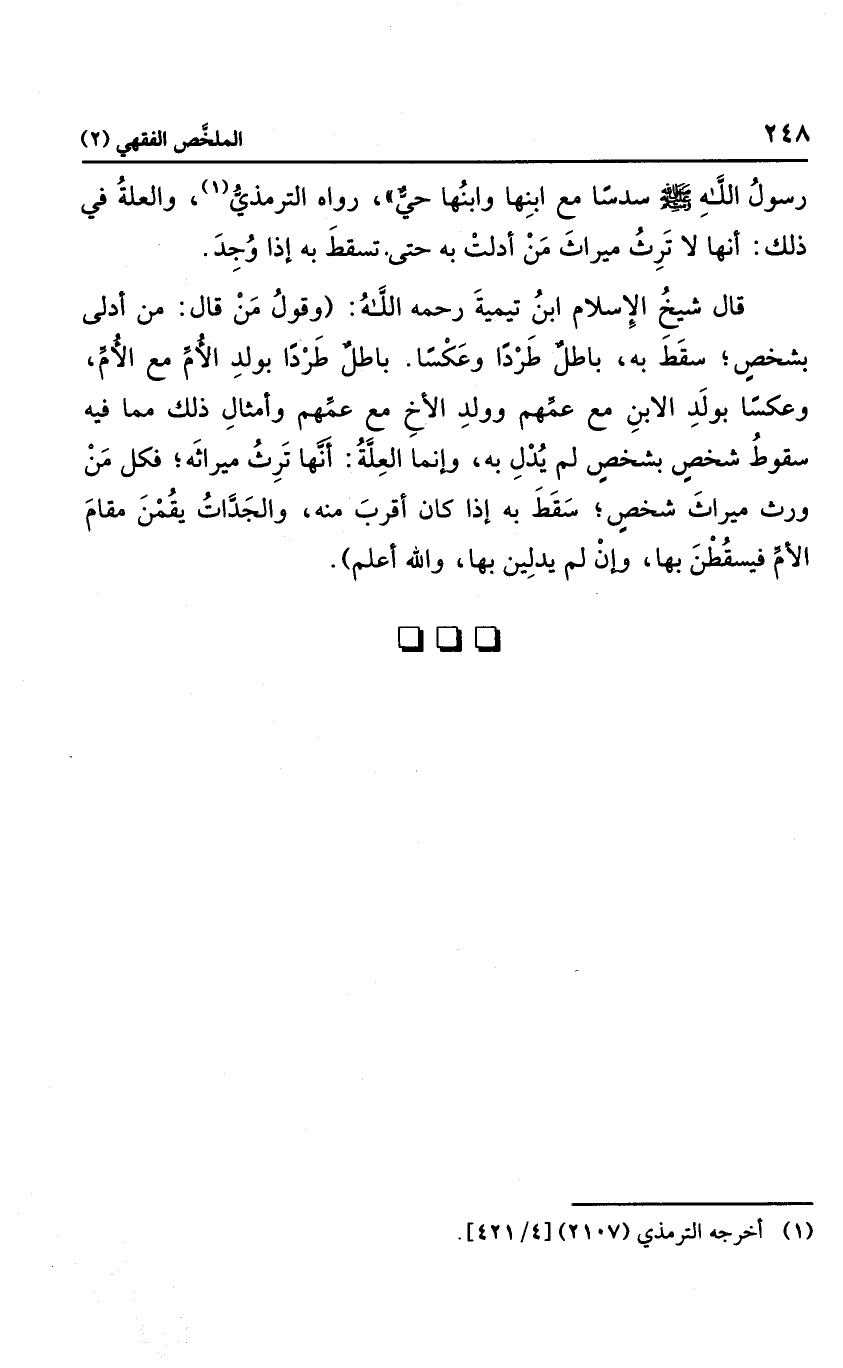 قال شيخ الإسلام ابن تيمية رحمه الله: "وقول من قال: من أدلى بشخص؛ سقط به: باطل طردًا وعكسا، باطل طردًا بولد الأم مع الأم، وعكسا بولد البن مع عمهم وولد الأخ مع عمهم وأمثال ذلك مما فيه سقوط شخص بشحص لم يدل به، وإنما العلة أنها ترث ميراثه؛ فكل من ورث ميراث شخص بشخص لم يدل به، وإنما العلة أنها ترث ميراثه؛ فكل من ورث ميراث شخص؛ سقط به إذا كان أقرب منه، والجدات يقمن الأم فيستقطن بها، وإن لم يدلين بها، والله أعلم".