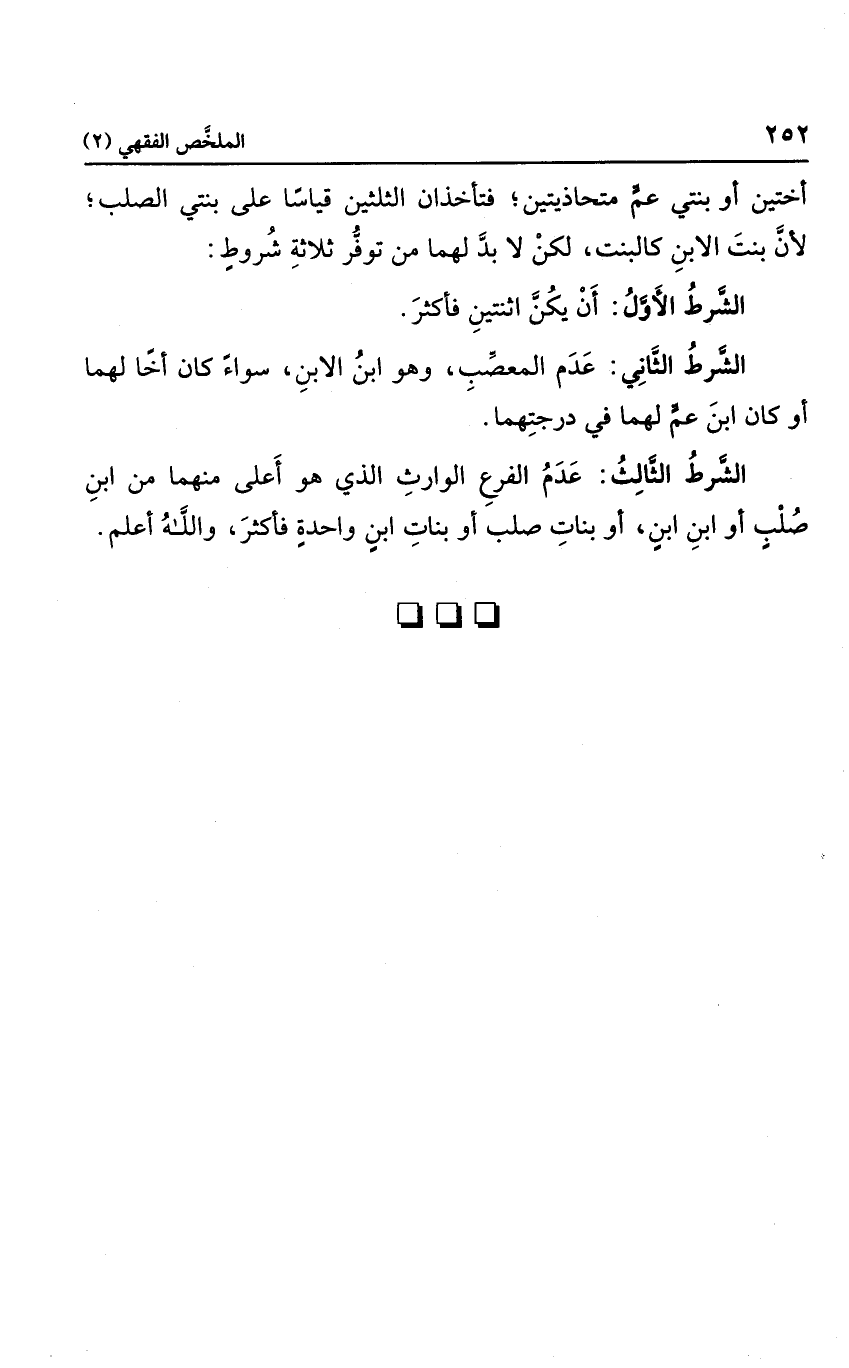 الشرط الثالث: عدم الفرع الوارث الذي هو أعلى منهما من ابن صلب أو ابن أو بنات ابن واحدة فأكثر، والله أعلم.