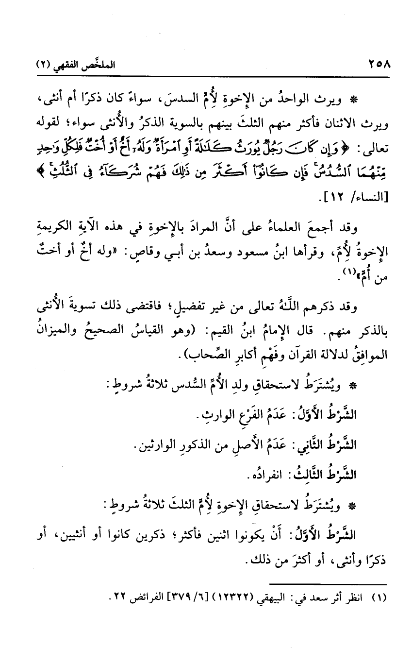 ويرث الواحد من الأخوة لأم السدس، سواء كان ذكرًا أم أنثى، ويرث الاثنتين فأكثر منهم الثلث بينهم بالسوية الذكر والأنثى سواء؛ لقوله تعالى: {وَإِنْ كَانَ رَجُلٌ يُورَثُ كَلالَةً أَوِ امْرَأَةٌ وَلَهُ أَخٌ أَوْ أُخْتٌ فَلِكُلِّ وَاحِدٍ مِنْهُمَا السُّدُسُ فَإِنْ كَانُوا أَكْثَرَ مِنْ ذَلِكَ فَهُمْ شُرَكَاءُ فِي الثُّلُث} ، وقد أجمع العلماء على أن المراد بالأخوة في هذه الآية الكريمة الأخوة لأم، وقرأها ابن مسعود وسعد ابن أبي وقاص: "وله أخ أو أخت من أم".