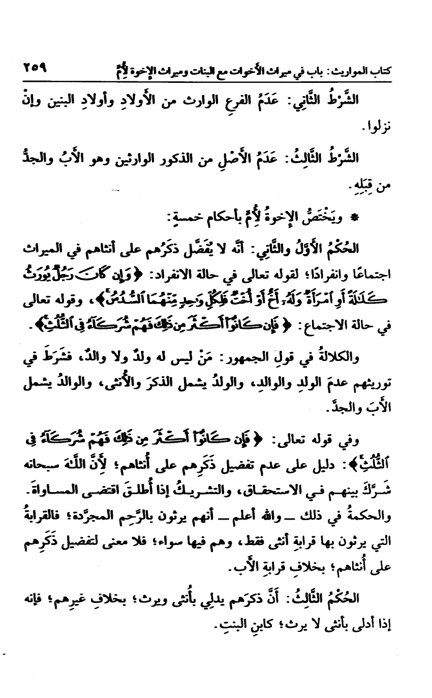 والكلالة في قول الجمهور: من ليس له ولد ولا والد، فشرط توريثهم عدم الولد والوالد، والولد يشمل الذكر والأنثى، والوالد يشمل الأب والجد وفي قوله تعالى: {فَإِنْ كَانُوا أَكْثَرَ مِنْ ذَلِكَ فَهُمْ شُرَكَاءُ فِي الثُّلُث} دليل على عدم تفضيل ذكرهم على أنثاهم؛ لأن الله سبحانه شرك بينهم في الاستحقاق، والتشريك إذا أطلق اقتضى المساواة.