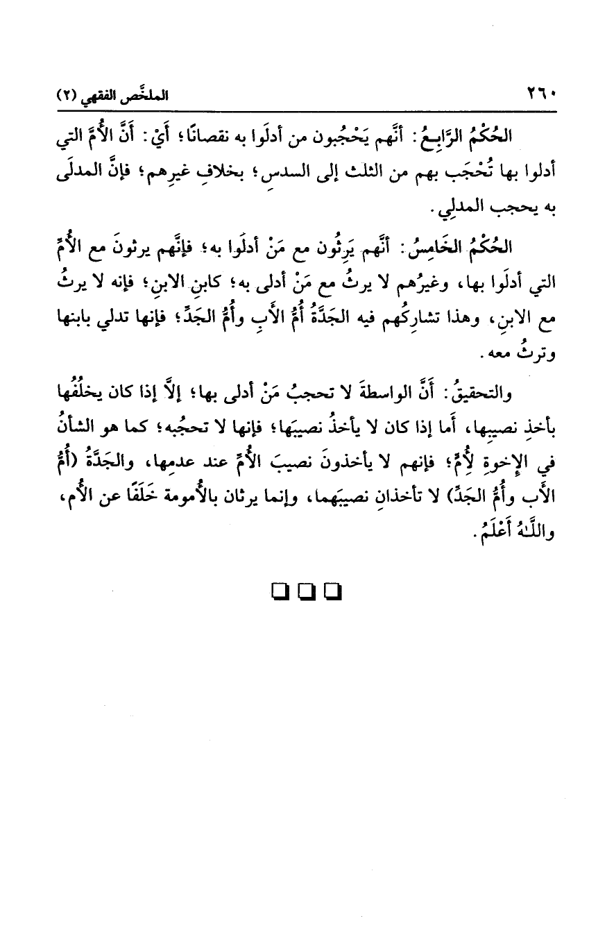 الحكم الخامس: أنهم يرثون مع من أدلوا به؛ فإنهم يرثون مع الأم التي أدلوا بها، وغيرهم لا يرث مع من أدلى به كابن الابن؛ فإنه لا يرث مع الابن، وهذا تشاركهم فيه الجدة أم الأب وأم الجد؛ فإنها تدلي بابنها وترث معه، والتحقيق أن الواسطة لا تحجب من أدلى بها؛ إلا إذا كان يخلفها بأخذ نصيبها، أما إذا كان لا يأخذ نصيبها فإنها لا تحجبه؛ كما هو الشأن في الأخوة لأم؛ فإنهم لا يأخذون نصيب الأم عند عدمها، والجدة أم الأب وأم الجد لا تأخذان نصيبها وإنما يرثان بالأمومة خلفا عن الأم، والله أعلم.