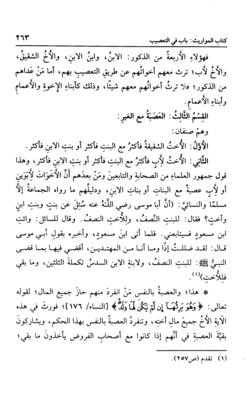 الثاني: الأخت لأب فأكثر مع البنت فأكثر أو بنت الابن فأكثر، وهذا قول جمهور العلماء من الصحابة والتابعين ومن بعدهم أن الأخوات لأبوين أو لأب عصبة مع البنات أو بنات الابن، ودليلهم ما رواه الجماعة إلا مسلما والنسائي: " أن أبا موسى رضي الله عنه سئل عن بنت وبنت ابن وأخت؟، فقال: للبنت النصف، وللأخت النصف. وقال للسائل: ائت ابن مسعود. فلما أتى ابن مسعود، وأخبر بقول أبي موسى؛ قال: لقد ضللت إذًا وما أنا من المهتدين، أقضي فيها بما قضى النبي صلى الله عليه وسلم: للبنت النصف، ولابنة الابن السدس تكملة الثلثين، وما بقي فللأخت".