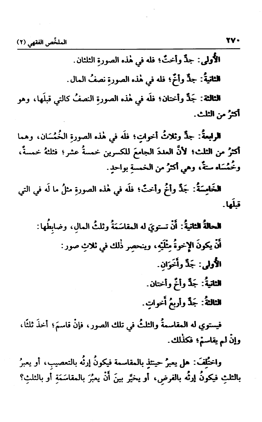 الرابعة: جد وثلاث أخوات؛ فله في هذه الصورة الخمسان، وهما أكثر من الثلث؛ لأن العدد الجامع للكسرين خمسة عشر؛ فثلثه خمسة وخمساه ستة، وهي أكثر من الخمسة بواحد.