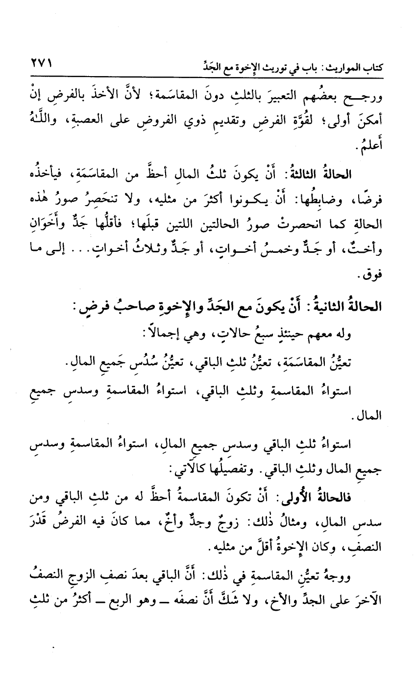 فالحالة الأولى: أن تكون المقاسمة أحظ له من الثلث الباقي ومن سدس المال؛ ومثال ذلك: زوج وجد وأخ، مما كان فيه الفرض قدر النصف، وكانت الأخوة أقل من مثليه.