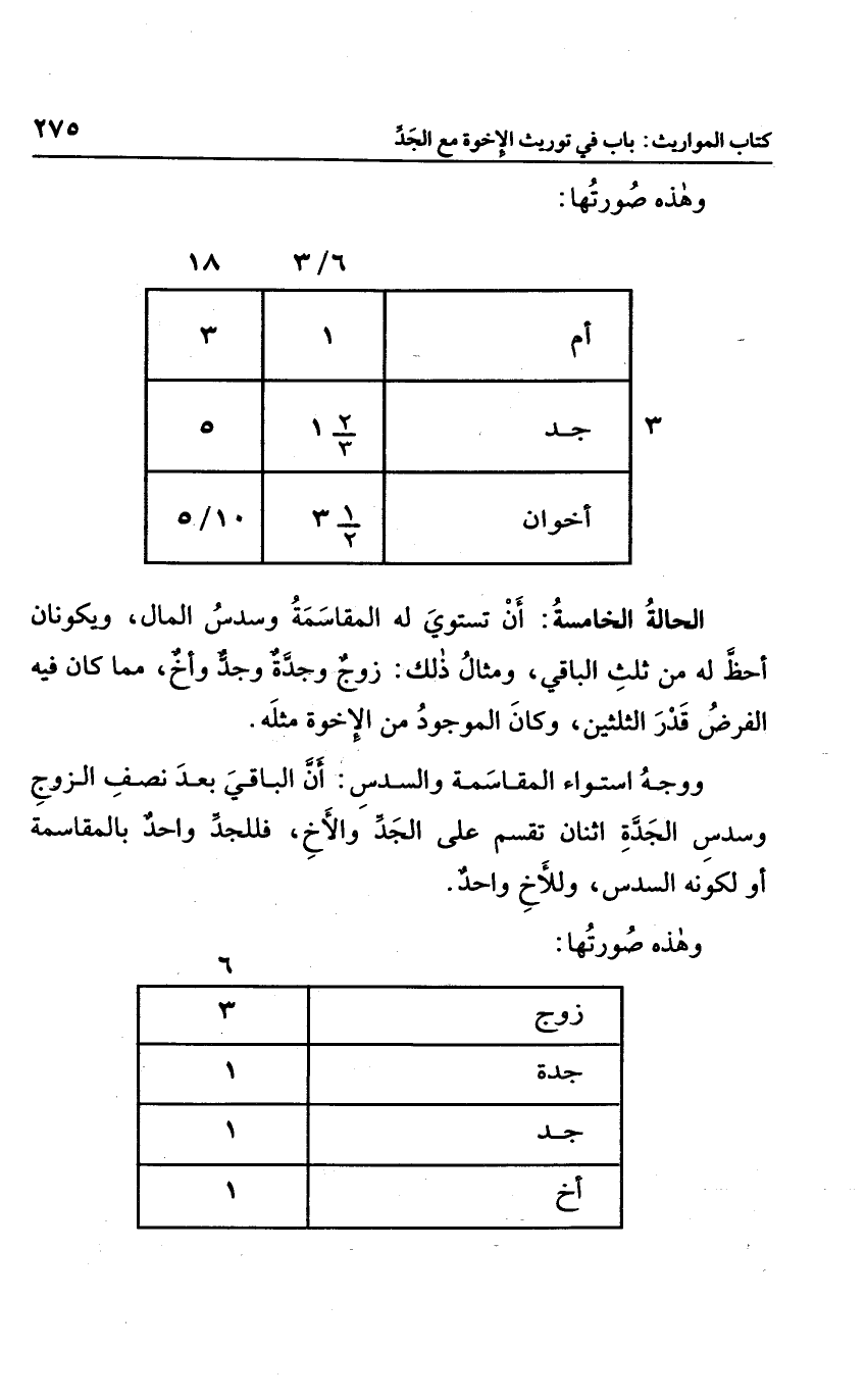 الحالة الخامسة: أن تستوي له المقاسمة وسدس المال، ويكونان أحظ له من ثلث الباقي، ومثال ذلك زوج وجدة وجد وأخ، مما كان فيه الفرض قدر الثلثين، وكان الموجود من الأخوة مثله.