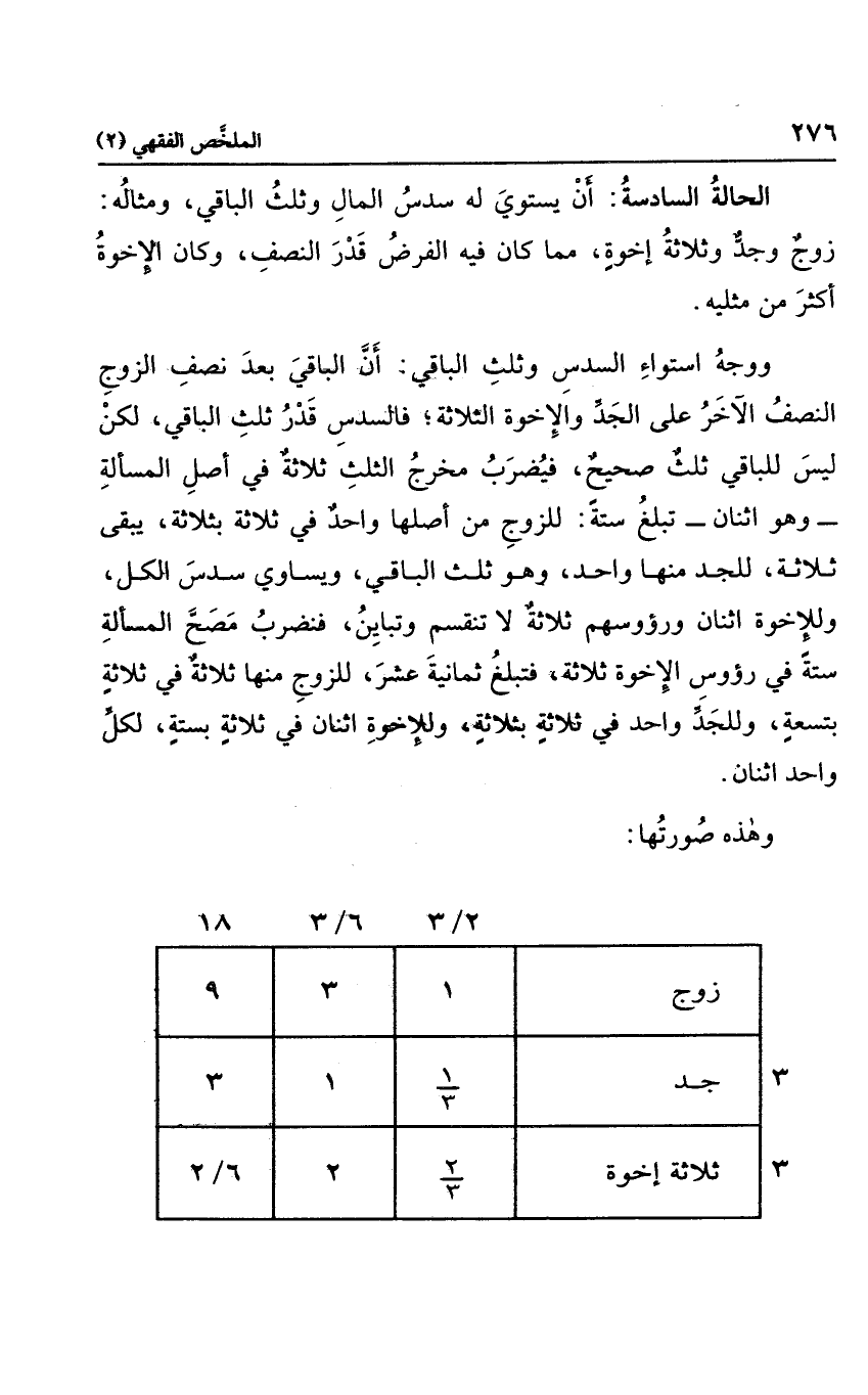 ووجه استواء السدس وثلث الباقي أن الباقي بعد نصف الزوج النصف الآخر على الجد والأخوة الثلاثة؛ فالسدس قد ثلث الباقي، لكن ليس للباقي ثلث صحيح، فتضرب مخرج الثلث ثلاثة في أصل المسألة وهو اثنان تبلغ ستة، للزوج من أصلها واحد في ثلاثة بثلاثة، يبقى ثلاثة، للجد منها واحد، وهو ثلث الباقي، ويساوي سدس الكل، وللإخوة اثنان ورؤوسهم ثلاثة تنقسم وتباين، فنضرب مصح المسألة ستة في رؤوس الأخوة ثلاثة، فتبلغ ثمانية عشر، للزوج منها ثلاثة في ثلاثة بتسعة، وللجد واحد في ثلاثة بثلاثة، وللإخوة اثنان في ثلاثة بسنة، لكل واحد اثنان.