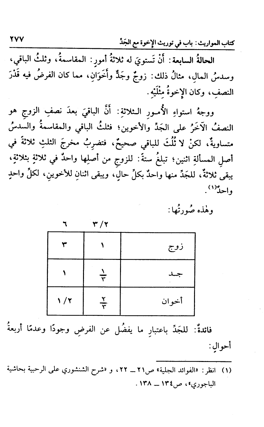 ووجه استواء الأمور الثلاثة: أن الباقي بعد نصف الزوج هو النصف الآخر على الجد والأخوين؛ فثلث الباقي والمقاسمة والسدس متساوية، لكن لا ثلث للباقي صحيح، فتضرب مخرج الثلث ثلاثة في أصل المسألة اثنين؛ تبلغ ستة، للزوج من أصلها واحد في ثلاثة بثلاثة، يبقى ثلاثة، للجد منها واحد بكل حال، ويبقى اثنان للأخوين، لكل واحد واحد1.