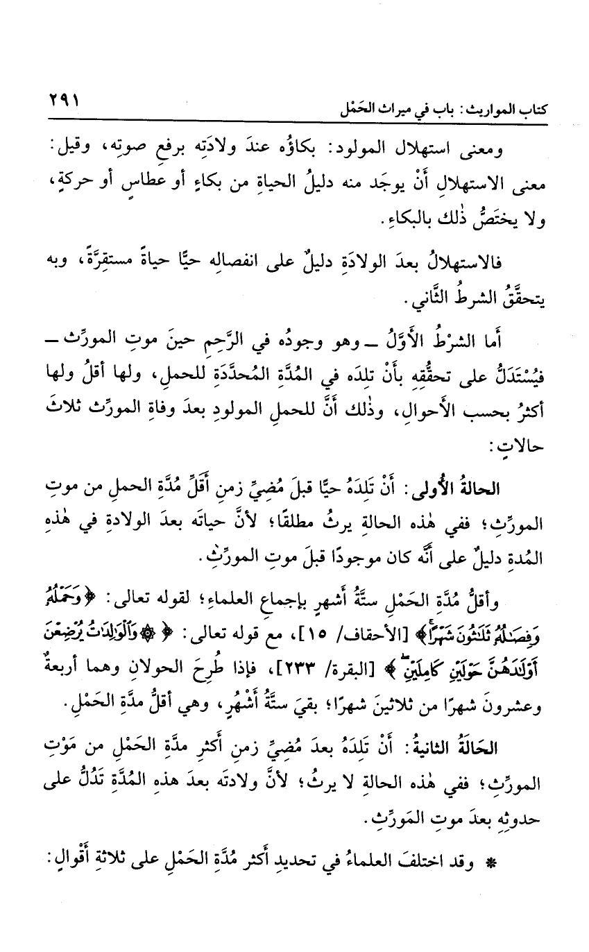 الحالة الأولى: أن تلده حيّا قبل مضي زمن أقل مدة الحمل من موت المورث؛ ففي هذه الحالة يرث مطلقا؛ لأن حياته بعد الولادة في هذه المدة دليل على انه كان موجودًا قبل موت المورث، وأقل مدة الحمل ستة أشهر بإجماع العلماء؛ لقوله تعالى: {وَحَمْلُهُ وَفِصَالُهُ ثَلاثُونَ شَهْراً} ، مع قوله تعالى: {وَالْوَالِدَاتُ يُرْضِعْنَ أَوْلادَهُنَّ حَوْلَيْنِ كَامِلَيْن} ، فإذا طرح الحولان وهما أربعة وعشرون شهرًا من ثلاثين شهرًا؛ بقى ستة أشهر، وهي أقل مدة الحمل.