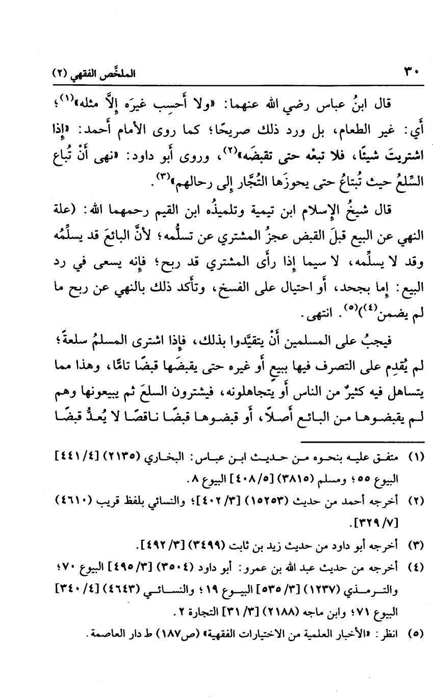 قال ابن عباس رضي الله عنهما "ولا أحسب غيره إلا مثله"؛ أي: غير الطعام، بل ورد ذلك صريحا؛ كما روى الإمام أحمد: "إذا اشتريت شيئا؛ فلا تبعه حتى تقبضه"، وروى أبو داود: "نهى أن تباع السلع حيث تبتاع حتى يحوزها التاجر إلى رحالهم".