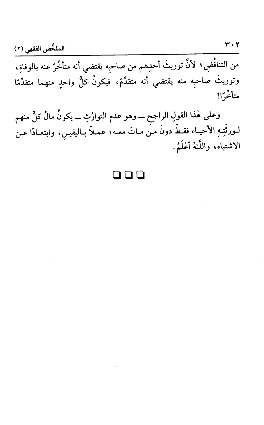 من التناقض؛ لأن توريث أحدهم من صاحبه يقتضي أنه متأخر عنه بالوفاة، وتوريث صاحبه منه يقتضي أنه متقدم، فيكون كل واحد منهما متقدما متأخرًا؛ فعلى هذا القول الراجح وهو عدم التوارث يكون مال كل منهم لورثته الأحياء فقط دون من مات معه؛ عملاً باليقين، وابتعادًا عن الاشتباه، والله أعلم.