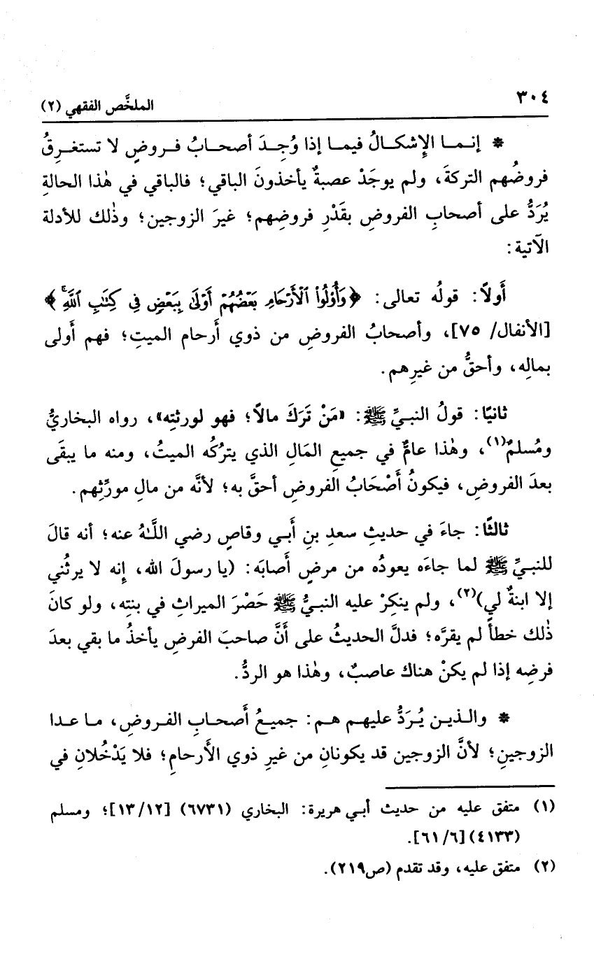 ثانيا: قول النبي صلى الله عليه وسلم: "من ترك مالا فهو لورثته"، رواه البخاري ومسلم، وهذا عام في جميع المال الذي يتركه الميت، ومنه ما يبقى بعد الفروض، فيكون أصحاب الفروض أحق به؛ لأنه من مال مورثهم.