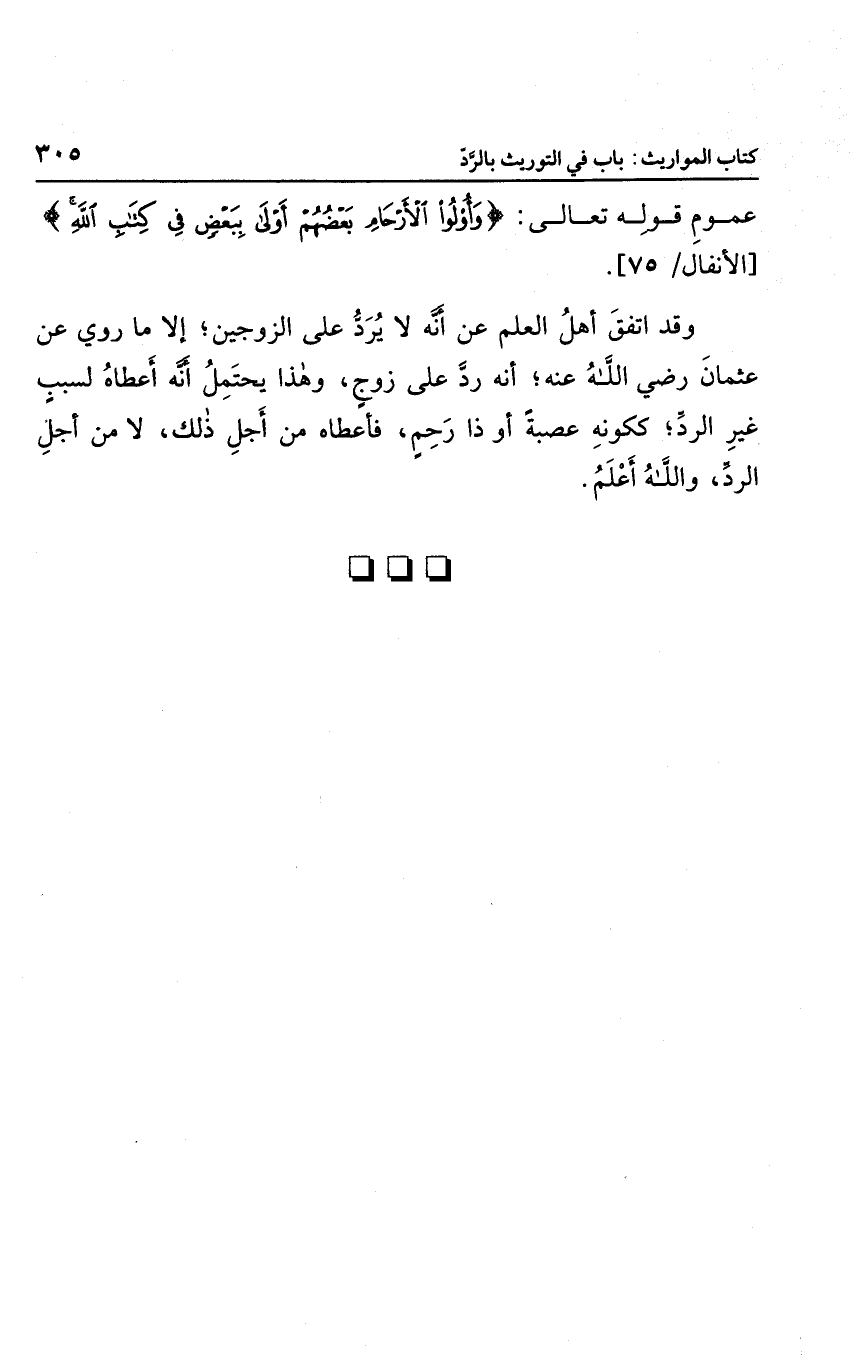 وقد اتفق أهل العلم على أنه لا يرد على الزوجين؛ إلا ما روي عن عثمان رضي الله عنه، أنه رد على زوج، وهذا يحتمل أنه أعطاه لسبب غير الرد؛ ككونه عصبة أو ذا رحم، فأعطاه من أجل ذلك، لا من أجل الرد. والله أعلم.