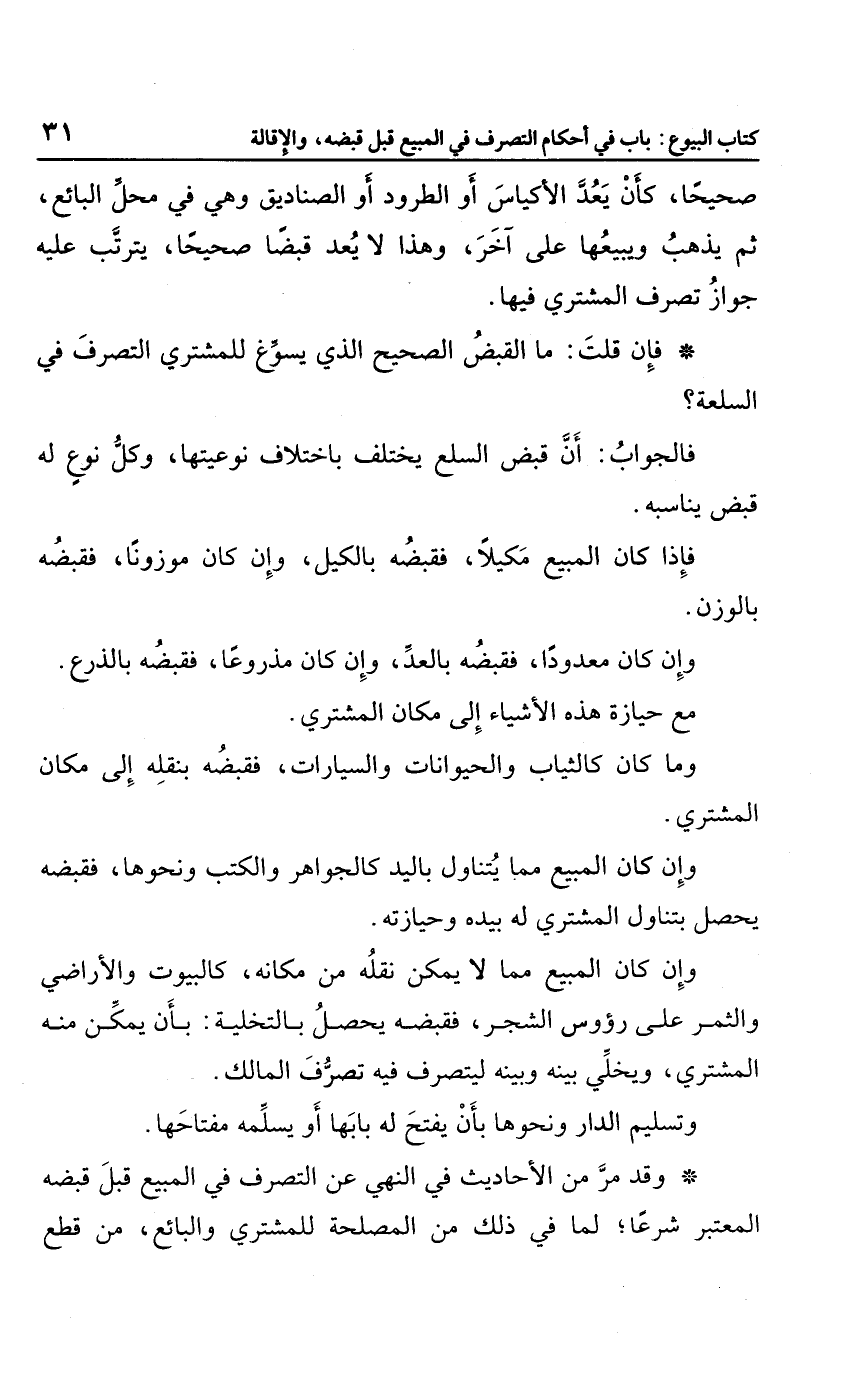 فإن قلت: ما هو القبض الصحيح الذي يسوغ للمشتري التصرف في السلعة؟ فالجواب أن قبض السلع يختلف باختلاف نوعيتها، وكل نوع له قبض يناسبه، فإذا كان المبيع مكيلاً؛ فقبضه بالكيل، وإن كان موزونا؛ فقبضه بالوزن، وإن كان معدودًا؛ فقبضه بالعد، وإن كان مذروعا؛ فقبضه بالذرع، مع حيازة هذه الأشياء إلى مكان المشتري، وما كان كالثياب والحيوانات والسيارات؛ فقبضه بنقله إلى مكان المشتري، وإن كان المبيع مما يتناول باليد كالجواهر والكتب ونحوها؛ فقبضه يحصل بتناول المشتري له بيده وحيازته، وإن كان المبيع مما لا يمكن نقله من مكانه؛ كالبيوت والأراضي والثمر على رؤوس الشجر؛ فقبضه يحصل بالتخلية؛ بأن يمكن منه المشتري، ويخلي بينه وبينه ليتصرف فيه تصرف المالك، وتسليم الدار ونحوها بأن يفتح له بابها أو يسلمه مفتاحها.
