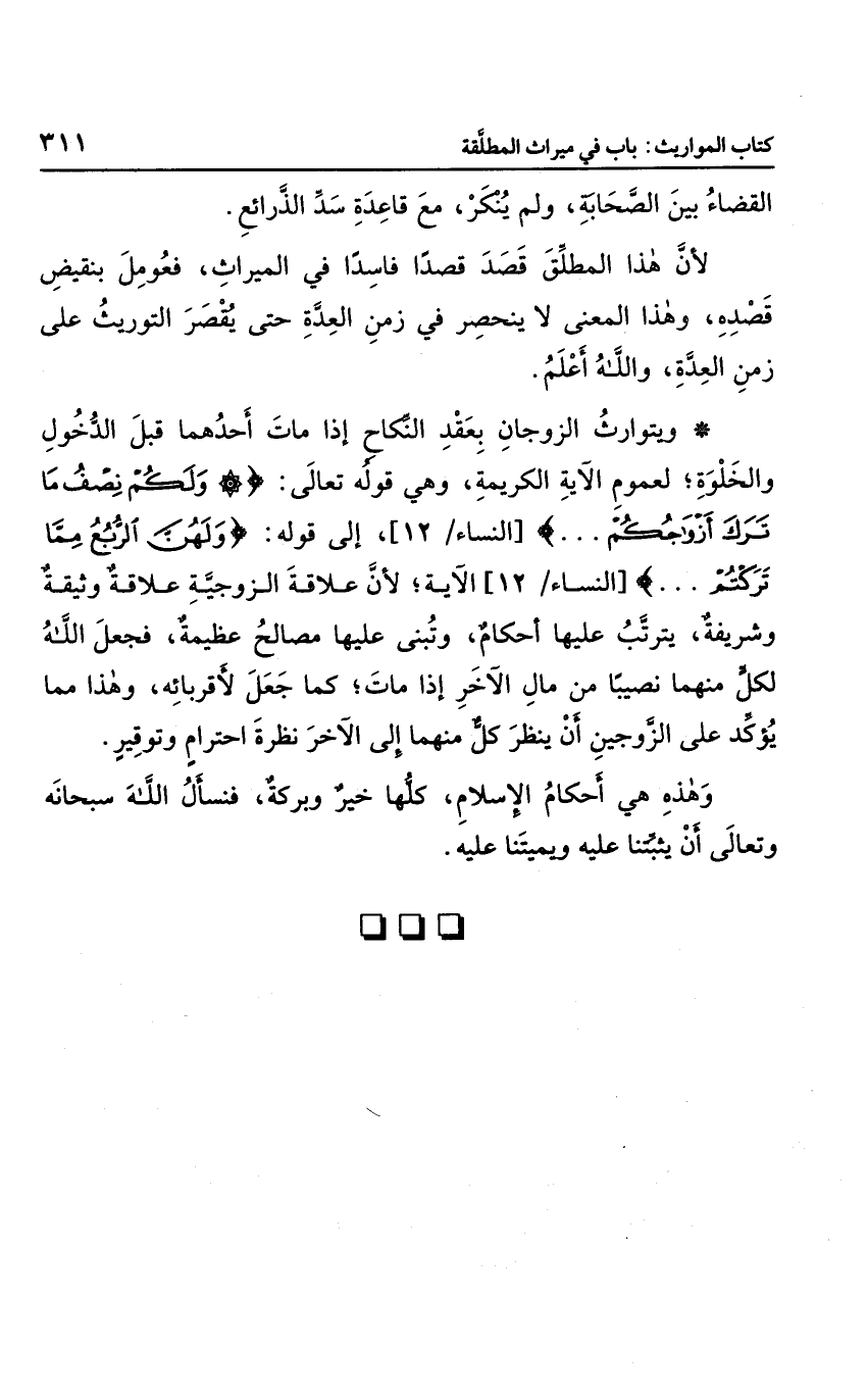 القضاء بين الصحابة، ولم ينكر، مع قاعدة سد الذرائع؛ لأن هذا المطلق قصد قصدا فاسدا في الميراث، فعومل بنقيض قصده، وهذا المعنى لا ينحصر في زمن حتى يقصر التوريث على زمن العدة، والله أعلم.