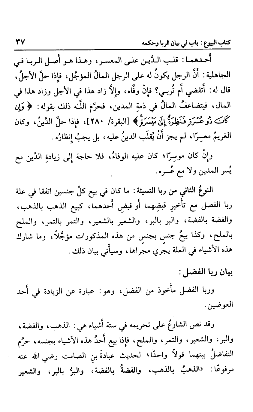 أحدهما: قلب الدين على العسر، وهذا هو أصل الربا في الجاهلية أن الرجل يكون له على الرجل المال المؤجل، فإذا حل الأجل؛ قال له: أتقضي أم تربي؟ فإن وفاة، وإلا؛ زاد هذا في الأجل وزاد هذا في المال، فيتضاعف المال في ذمة المدين، فحرم الله ذلك بقوله: {وَإِنْ كَانَ ذُو عُسْرَةٍ فَنَظِرَةٌ إِلَى مَيْسَرَةٍ} ، فإذا حل الدين وكان الغريم معسرًا؛ لم يجز أن يقلب الدين عليه، بل يجب إنظاره، وإن كان موسراً؛ كان عليه الوفاء؛ فلا حاجة إلى زيادة الدين مع يسر المدين ولا مع عسره.