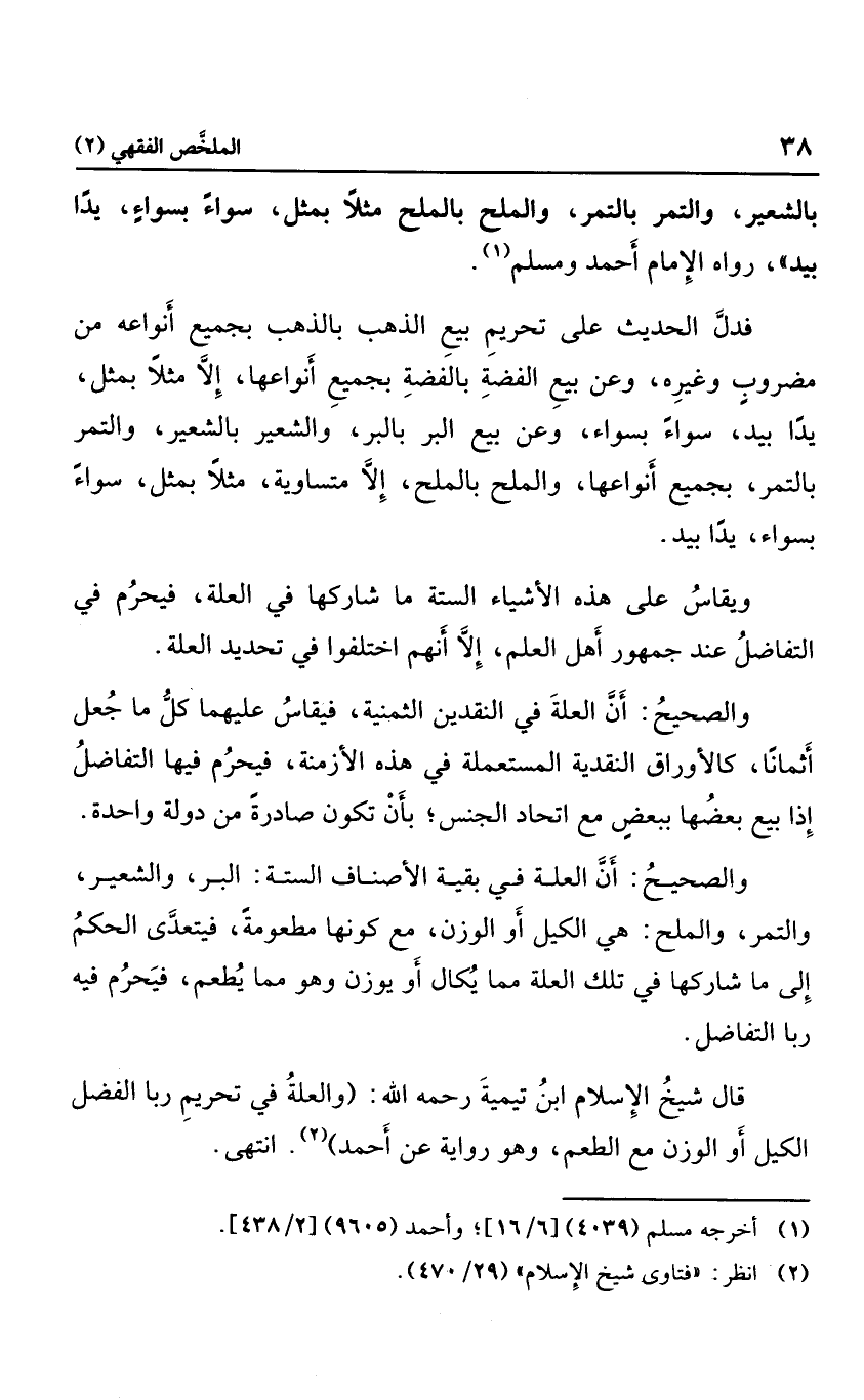 بالشعير، والتمر بالتمر، والملح بالملح؛ مثلاً بمثل، يدًا بيد"، رواه الإمام أحمد ومسلم، فدل الحديث على تحريم بيع الذهب بالذهب؛ إلا مثلاً بمثل، يدًا بيد، سواء بسواء، وعن بيع البر بالبر، والشعير بالشعير، والتمر بالتمر؛ بجميع أنواعها، والملح بالملح؛ إلا متساوية، مثلا بمثل، سواء بسواء، يدًا بيد.