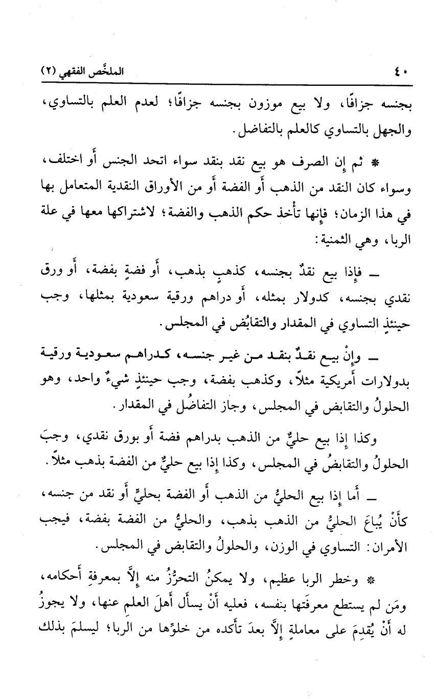 ثم إن الصرف هو بيع نقد بنقد سواء اتحد الجنس أو اختلف، وسواء كان النقد من الذهب أو الفضة أو من الأوراق النقدية المتعامل بها في هذا الزمان فإنها تأخذ حكم الذهب أو الفضة؛ لاشتراكها معها في علة الربا، وهي الثمنية. فإذا بيع نقد بجنسه؛ كذهب بذهب، أو فضة بفضة، أو ورق نقدي بجنسه؛ كدولار بمثله، أو دراهم ورقية سعودية بمثلها؛ وجب حينئذ التساوي في المقدار والتقايض في المجلس.