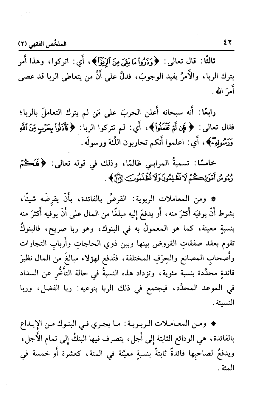 ومن المعاملات الربوية: ما يجري في البنوك من الإيداع بالفائدة، وهي الودائع الثابتة إلى أجل، يتصرف فيها البنك إلى تمام الأجل، ويدفع لصاحبها فائدة ثابتة بنسبة معنية في المئة؛ كعشرة أو خمسة في المئة.