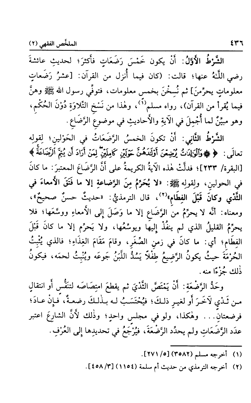 الشرط الثاني: أن تكون خمس الرضعات في الح ولين؛ لق وله تعالى: {وَالْوَالِدَاتُ يُرْضِعْنَ أَوْلادَهُنَّ حَوْلَيْنِ كَامِلَيْنِ لِمَنْ أَرَادَ أَنْ يُتِمَّ الرَّضَاعَةَ} ؛ فدلت هذه الآية الكريمة على أن الرضاع المعتبر ما كان في الحولين، ولقوله صلى الله عليه وسلم: "لا يحرم من الرضاع إلا ما فتق الأمعاء وكان قبل الفطام"، قال الترمذي: "حديث حسن صحيح"، ومعناه: أنه لا يحرم من الرضاع إلا ما وصل إلى الأمعاء ووسعها؛ فلا يحرم القليل الذي لم إليها ويوسعها، ولا يحرم إلا ما كان قبل الفطام؛ أي: ما كان في زمن الصغر، وقام مقام الغذاء؛ فالذي يثبت الحرمة حيث يكون الرضيع طفلاً يسد اللبن جوعه وينبت لحمه، فيكون ذلك جرءًا منه.