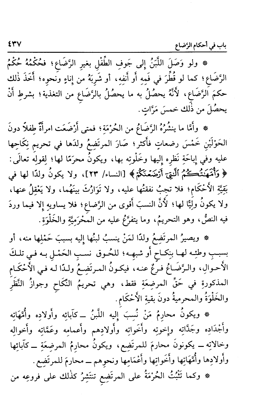 وتكون محارم من نسب إليه اللبن كآبائه وأولاده وأمهاته وأجداده وجداته وإخوته وأخواته وأولادهم وأعمامه وعماته وأخواله وخالاته يكونون محارم للمرتضع، وتكون محارم المرضعة كآبائها وأولادها وأمهاتها وأخواتها وأعمامها ونحوهم محارم للمرتضع.
