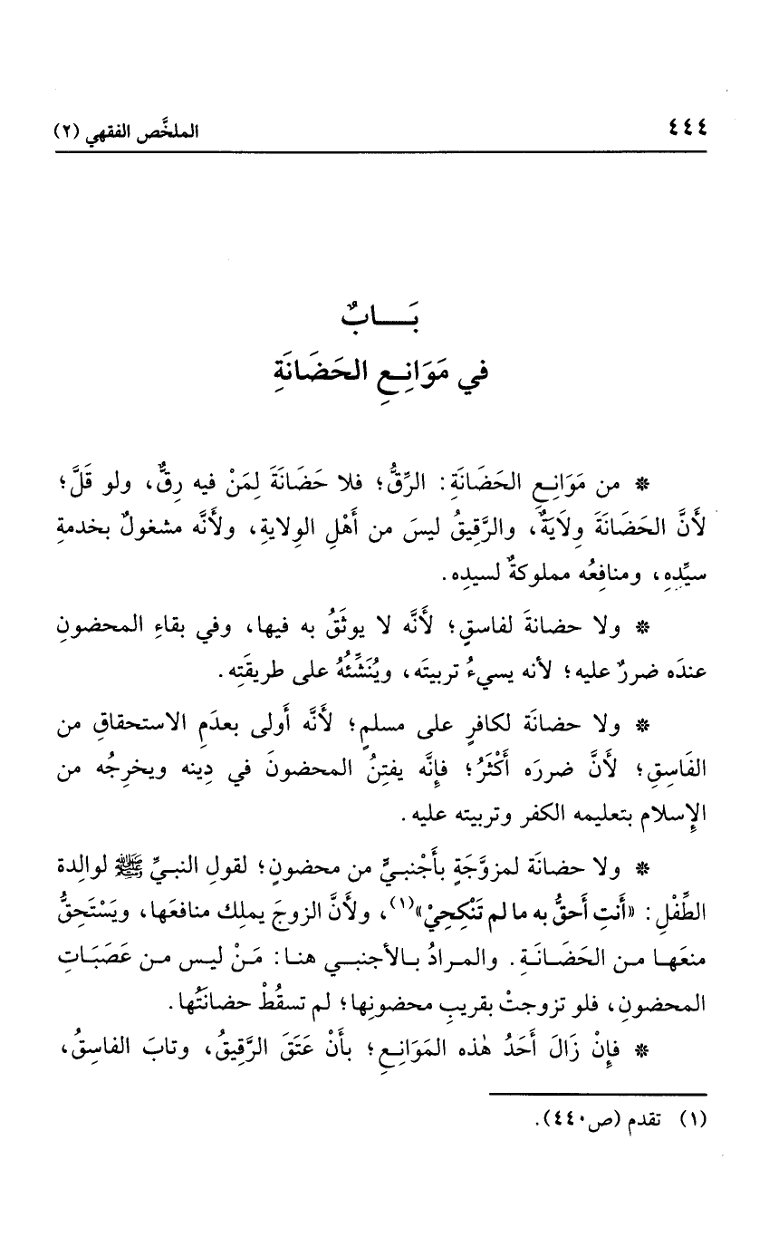 من موانع الحضانة: الرق؛ فلا حضانة لمن فيه رق، ولو قل لأن الحضانة ولاية، والرقيق ليس من أهل الولاية، ولأنه مشغول بخدمة سيده، ومنافعه مملوكة لسيده.