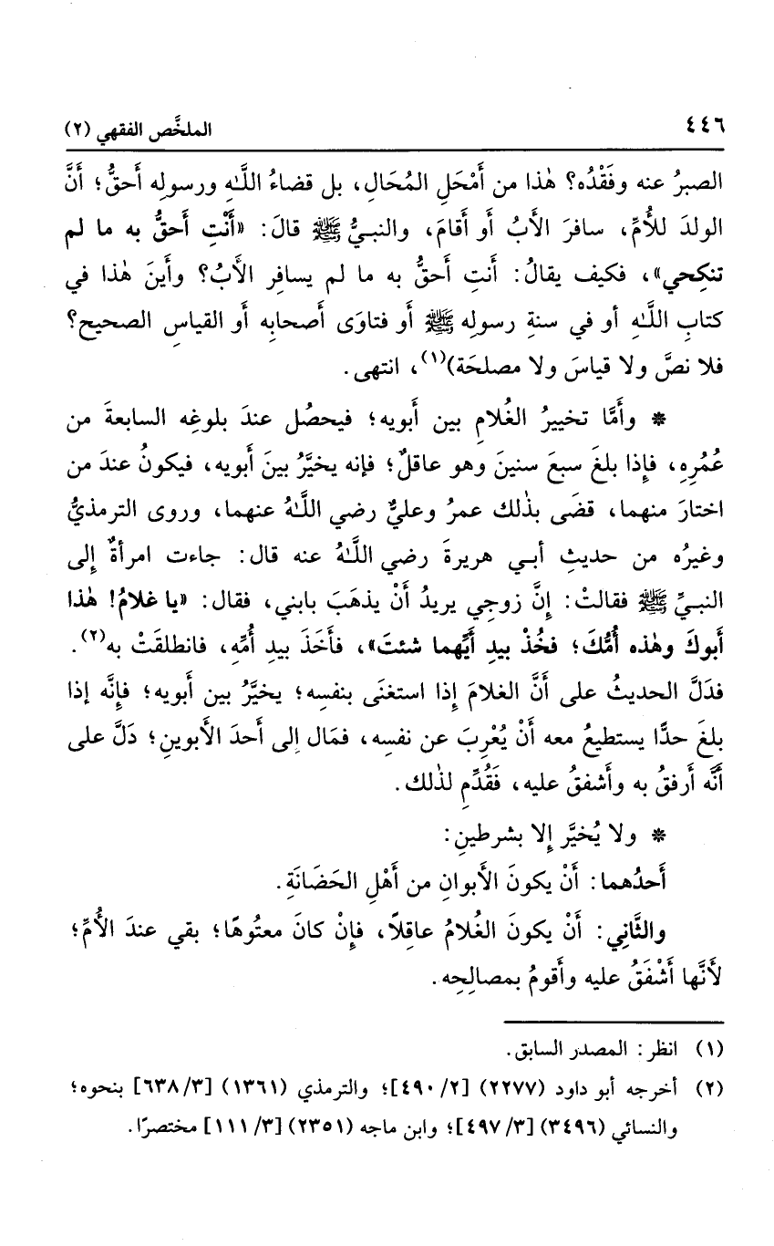 وروى الترمذي وغ يره من حديث أبي هريرة رضي الله عنه قال: جاءت ام رأة إلى النبي صلى الله عليه وسلم، فقالت: إن زوجي يريد أن يذهب ب ابني. فقال: "يا غلام! هذا أبوك وهذه أمك؛ فخذ بيد أيهما شئت. فأخذ بيد أمه، فانطلقت به"؛ فدل الحديث على أن الغلام إذا استغنى بنفسه؛ يخبر بين أبويه؛ فإنه إذا بلغ حدًا يستطيع معه أن يعرب عن نفسه، فمال إلى أحد الأبوين؛ دل على أنه أرفق به وأشفق عليه، فقدم لذلك.