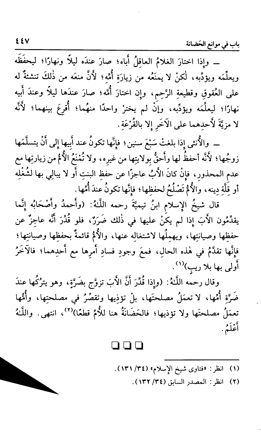 وقال رحمه الله: "وإذا قدر أن الأب تزوج بضرة، وهو يتركها عند ضرة أمها، لا تعمل مصلحتها، بل تؤذيها وتقصر في مصلحتها، وأمها تعمل مصلحتها ولا تؤذيها؛ فالحضانة هنا للأم قطع ا" انتهى، والله أعلم.
