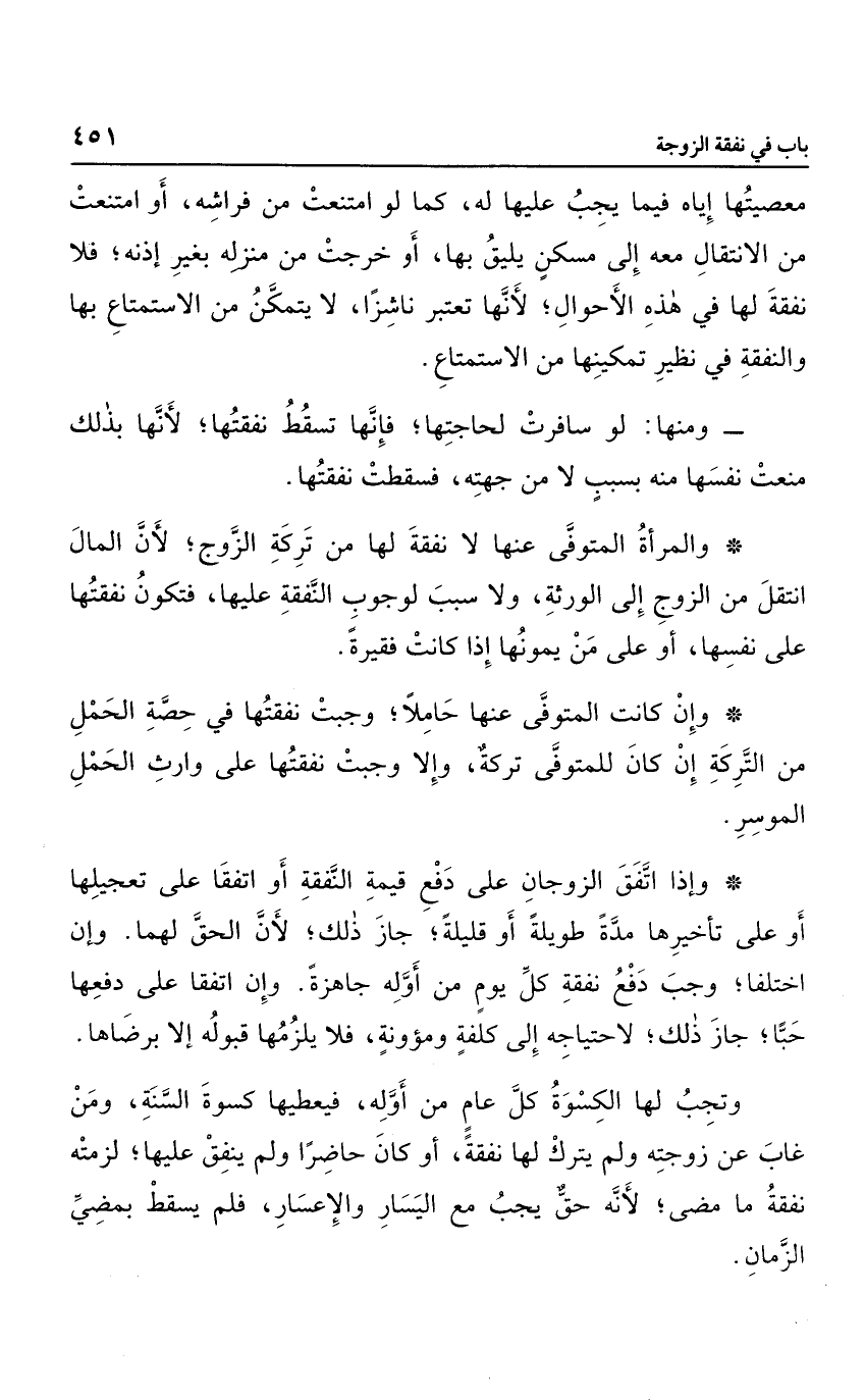 ومنها: لو سافرت لحاجتها؛ فإنها تسقط نفقتها؛ لأنها بذلك منعت نفسها منه بسبب لا من جهته، فسقطت نفقتها. والمرأة المتوفى عنها لا نفقة لها من تركة الزوج؛ لأن المال انتقل من الزوج إلى الورثة، ولا سبب لوجوب النفقة عليها، فتكون نفقتها على نفسها، أو على من يمونها إذا كانت فقيرة.