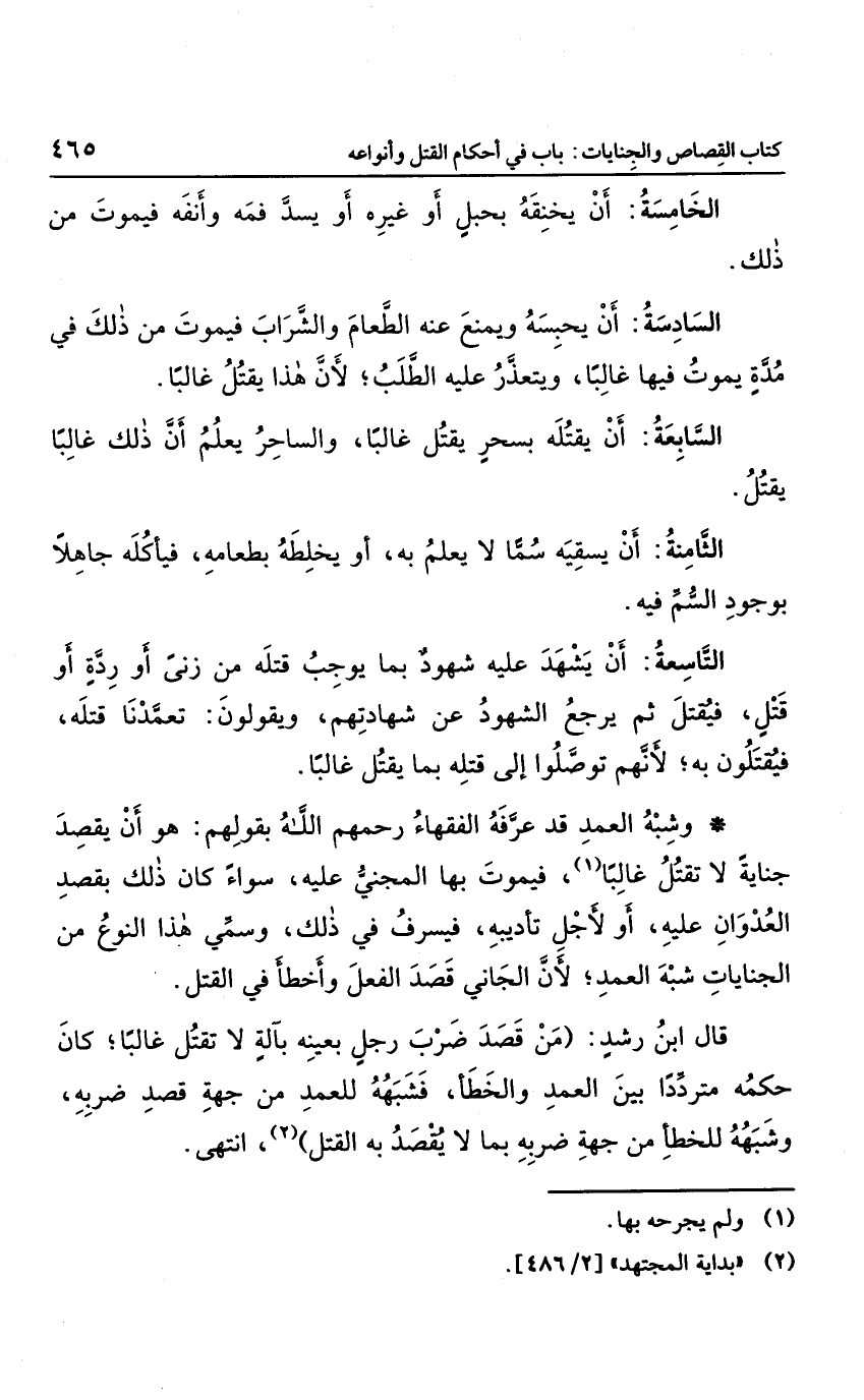قال ابن رشد: "من قصد ضرب رجل بعينه بآلة لا تقتل غالبا؛ كان حكمه مترددًا بين العمد والخطأ، فشبهه للعمد من جهة قصد ضربه، وشبهه للخطأ من جهة ضربه بما لا يقصد به القتل" انتهى.