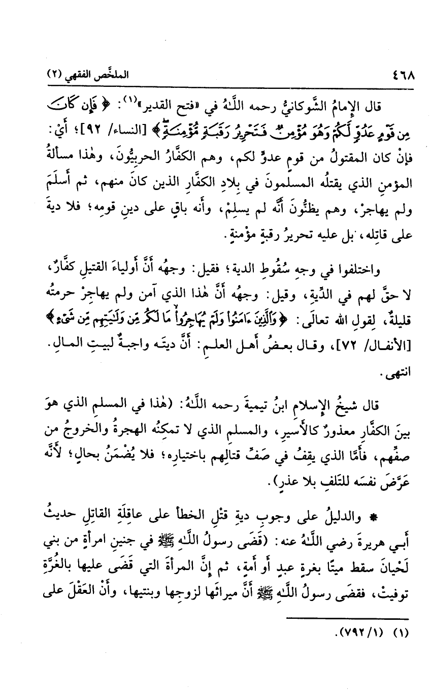 واختلفوا في وجه سقوط الدية؛ فقيل: وجهه أن أولياء القتيل كفار، لا حق لهم في الدية، وقيل: وجهه أن هذا الذي آمن ولم يهاجر حرمته قليلة؛ لقول الله تعالى: {وَالَّذِينَ آمَنُوا وَلَمْ يُهَاجِرُوا مَا لَكُمْ مِنْ وَلَايَتِهِمْ مِنْ شَيْءٍ} ، وقال بعض أهل العلم: إن ديته واجبة لبيت المال...." انتهى.