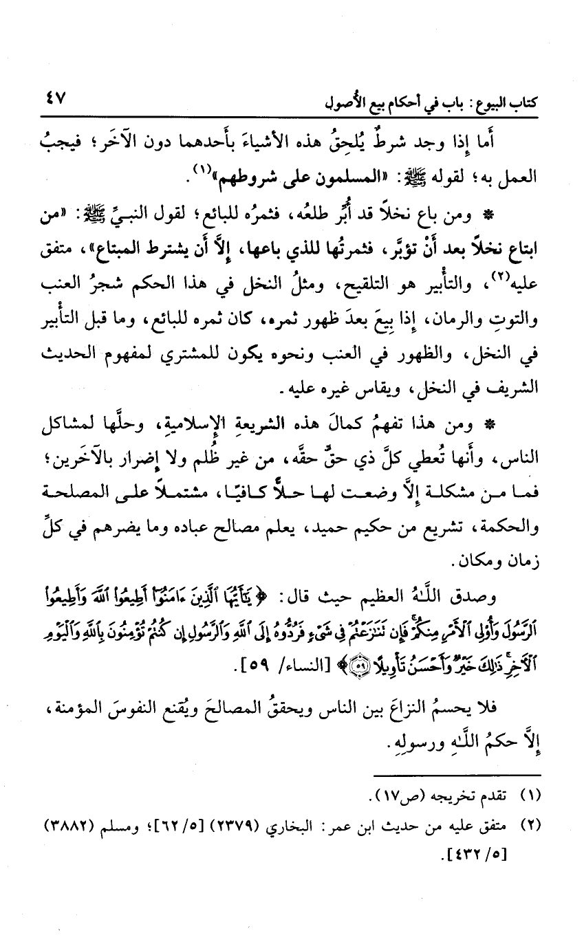 ومن باع نخلاً قد أبِّر طلعه؛ فثمره للبائع؛ لقول النبي صلى الله عليه وسلم: "من ابتاع نخلاً بعد أن تؤبر؛ فثمرتها للذي باعها؛ إلا أن يشترطه المبتاع"، متفق عليه، والتأبير هو التلقيح، ومثل النخل في هذا الحكم شجر العنب والتوت والرمان، إذا بيع بعد ظهور ثمره؛ كان ثمره للبائع، وما قبل التأبير في النخل والظهور في العنب ونحوه يكون للمشتري؛ لمفهوم الحديث الشريف في النخل، وقياس غيره عليه.